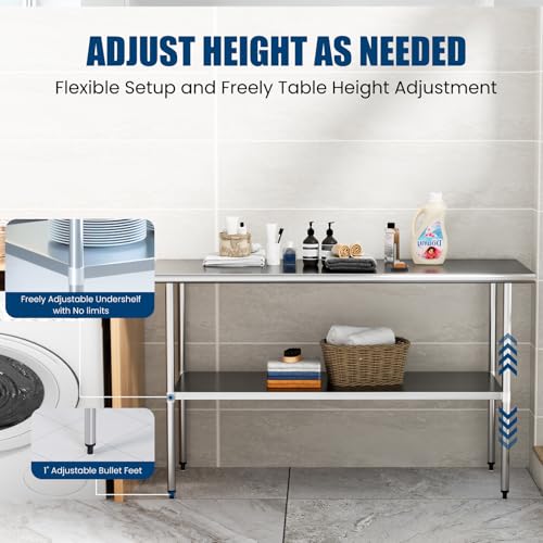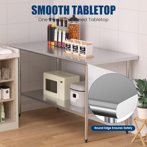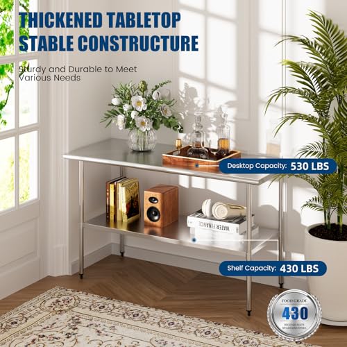 - Ample Work Area: Measuring 60x30x34 inches, this stainless steel kitchen table provides a generous workspace and adjustable shelf. Can bear weights up to 530 pounds on the table and 430 pounds per shelf, accommodating various storage needs