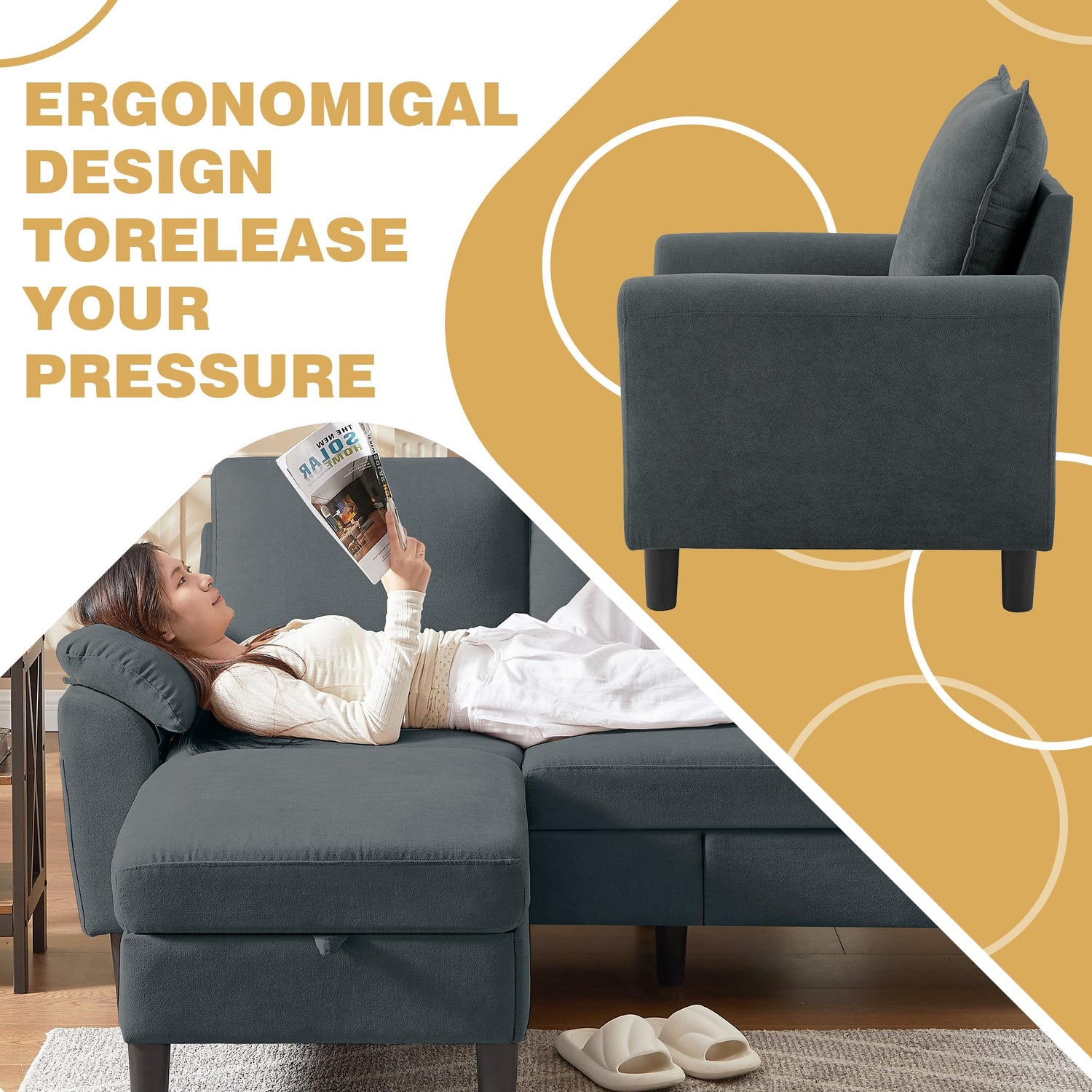 - Comfortable Sectional Sofa: The L-shaped sofa features a medium hardness cushion filled with high-density sponge and springs. This compact three seater sofa provides excellent support and elasticity, preventing it from sagging or sinking over time. It also features soft cushions and armrests, providing continuous comfort