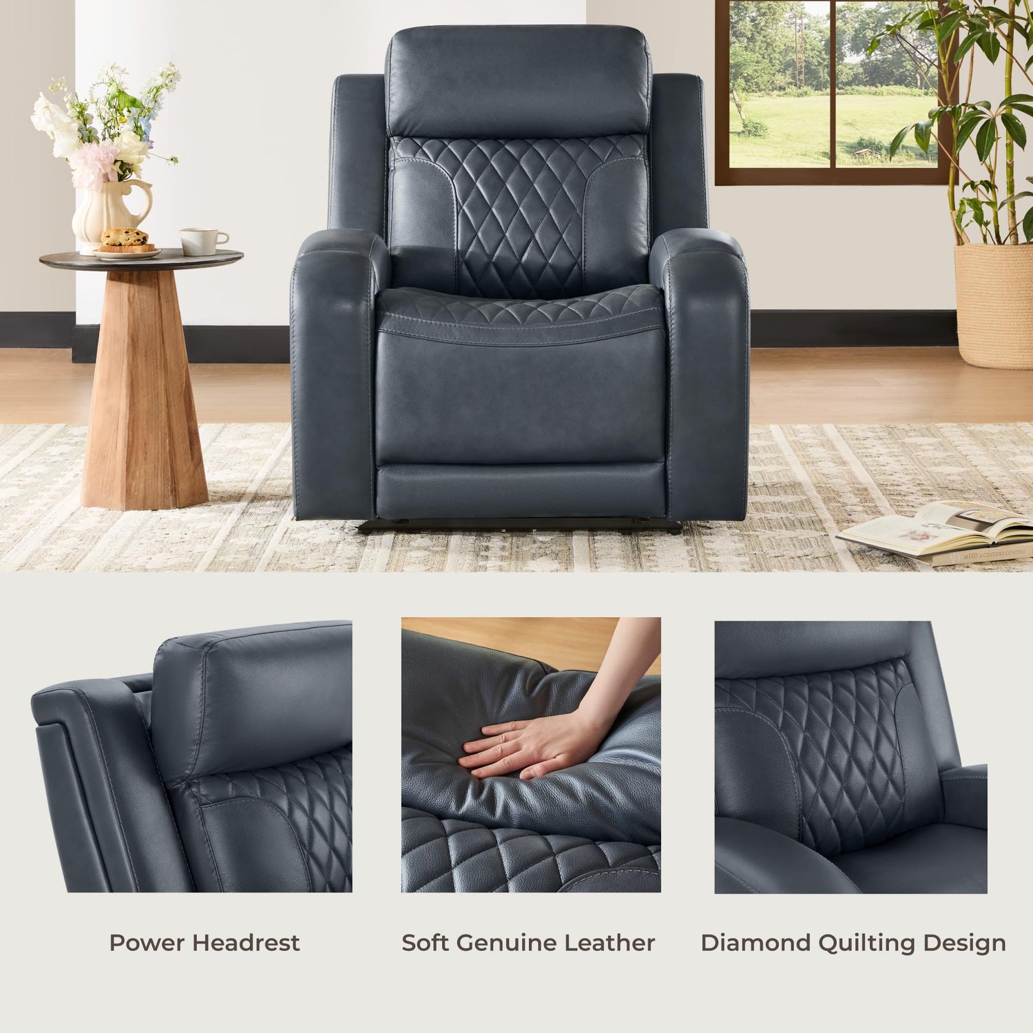 CHITA Genuine Leather Recliner Chair for Adults with Adjustable Power Headrest, Lay Flat Power Recliner with Slide-Out Cupholders & USB/Type-C Ports, Living Room Chair, Navy Blue