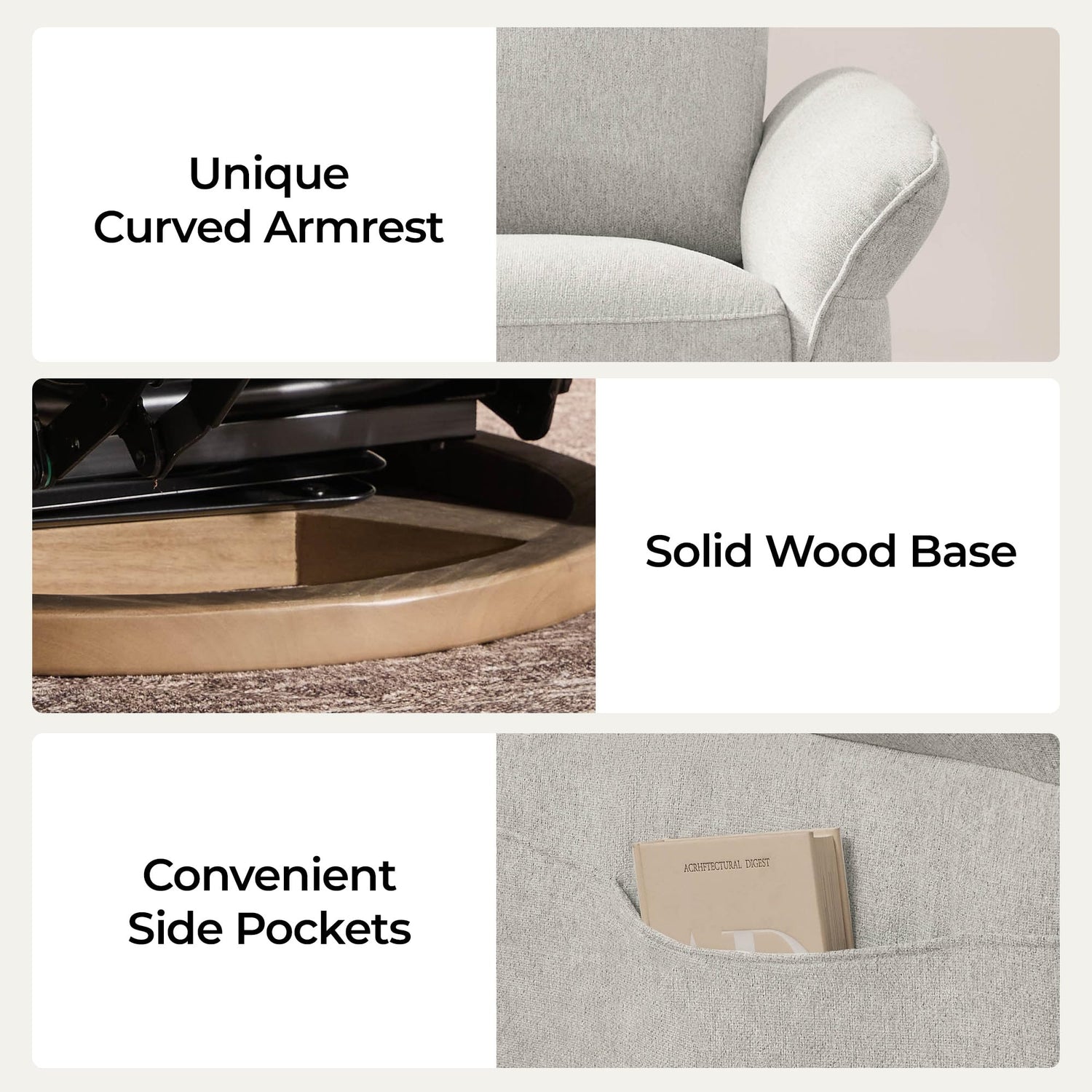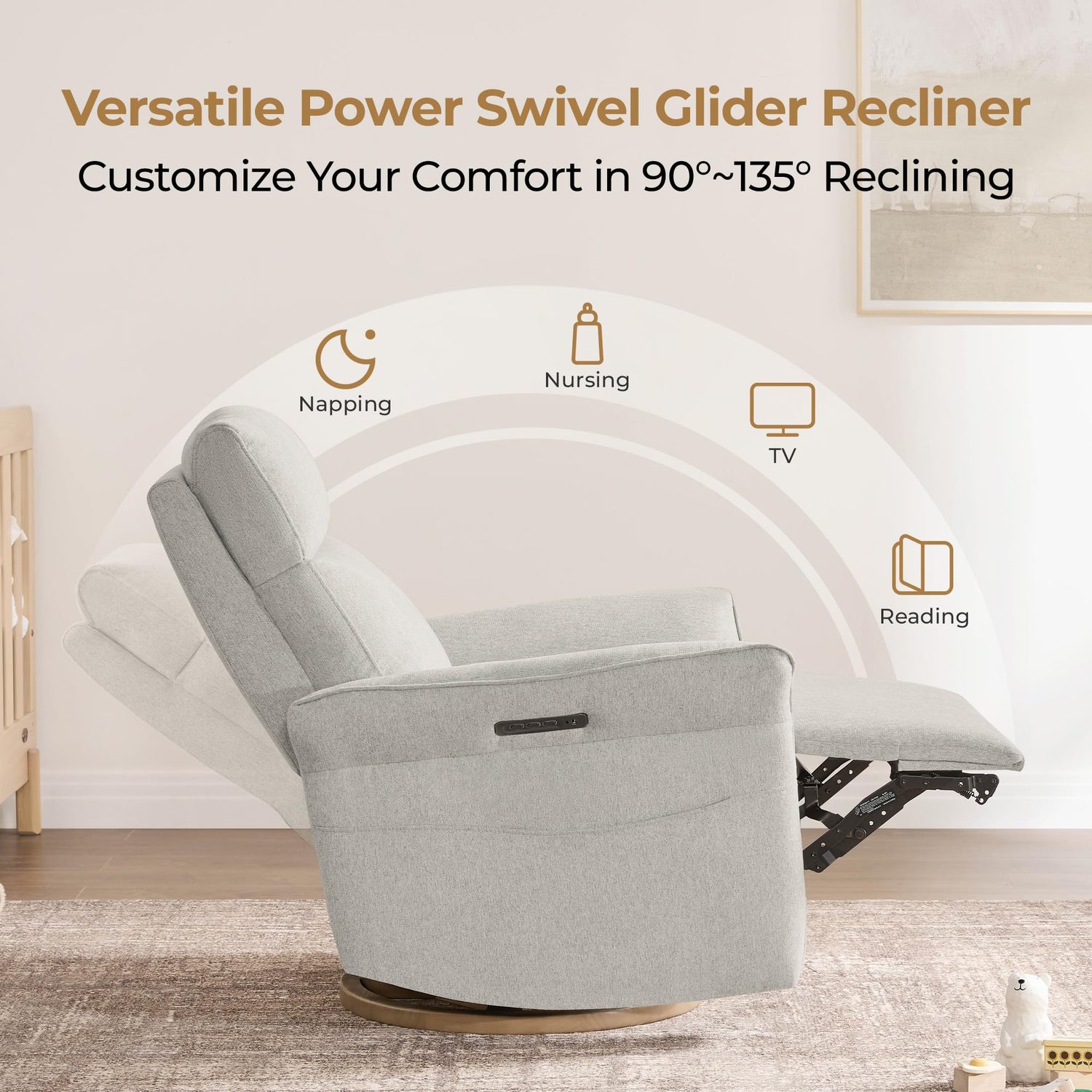 - Luxury Triple-Motor Power Swivel Nursery Glider: Elevate your nursery experience with this advanced power recliner chair, engineered for unparalleled comfort. A triple-motor power control system enables 270° swivel, smooth gliding and effortless 90-135° recline at the push of a button. Adjustable power headrest and lumbar support eliminate the need for extra pillows, cradling your body in every position.