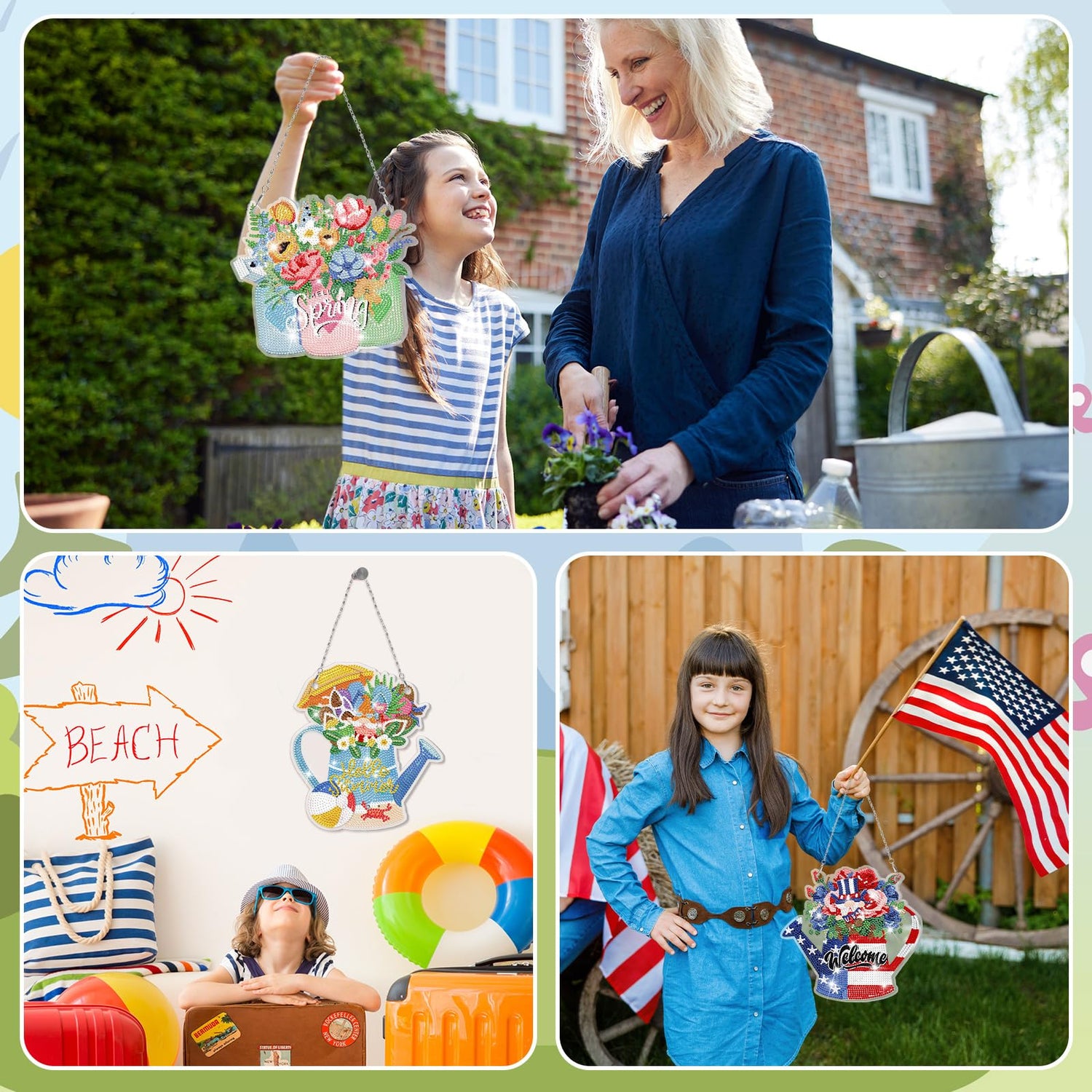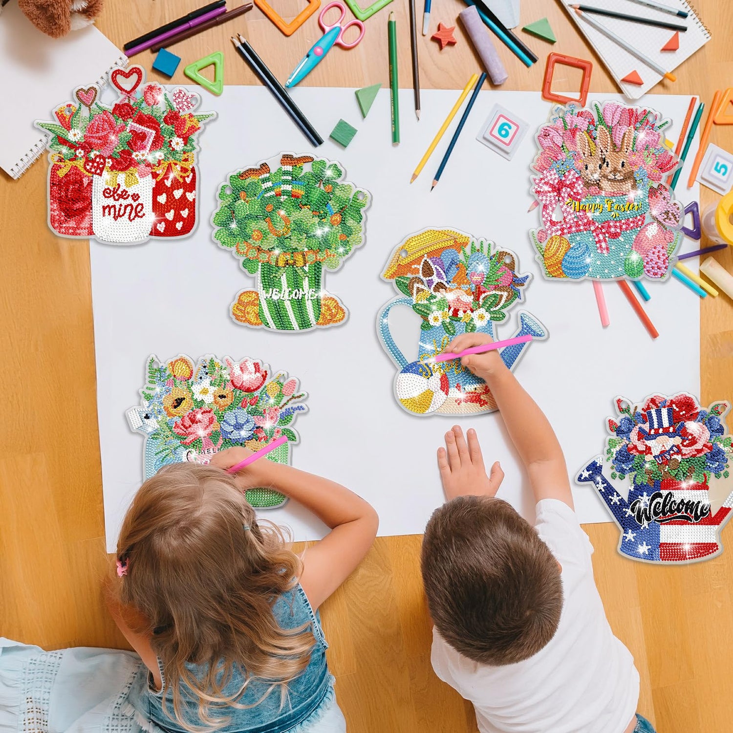 - Different Holiday Decorations: transform your space into a fairy land with these exquisite diamond painting kits; Each set includes 6 stunning designs featuring adorable rose flowers, shamrock flowers, bunny and eggs with flowers, Spring flower, Summer and Memorial Day vases with flower and so on; These diamond art signs well capture the essence of the season, adding a touch of festive charm to your room; Retro and eye catching, suitable for DIY and hanging at home for decoration