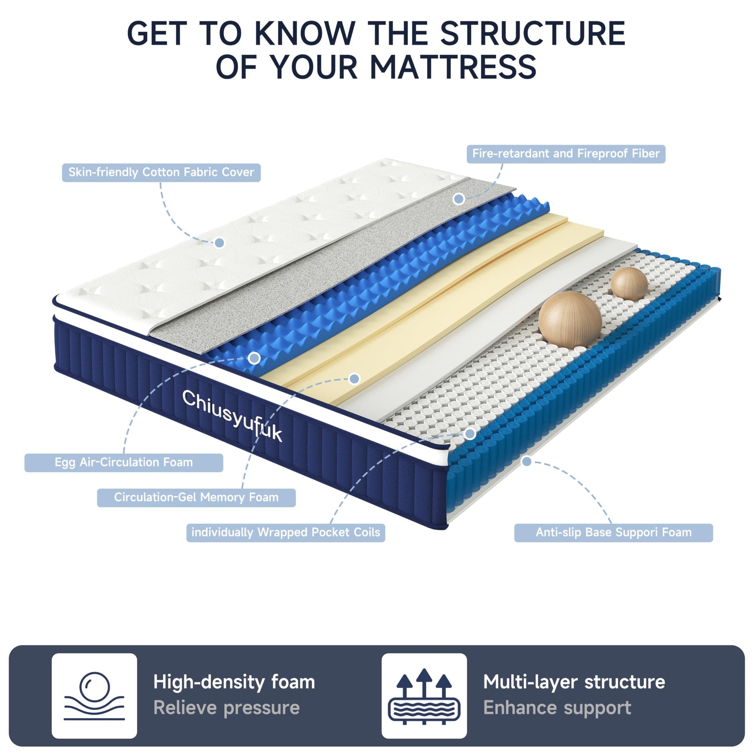 Chiusyufuk Full Mattress,10 inch Full Size Mattress,Hybrid mattresses,Single,Gel Memory Foam Individually Wrapped Pocket Coils Innerspring Pressure Relief,Soft,CertiPUR-US Certified,Fiberglass-Free,