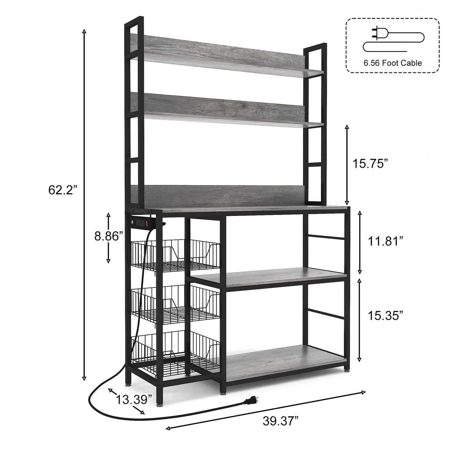 - 【Large Storage Capacity】 Size:13.39"D*39.37"W*62.2"H.the bakers rack has five open shelves with different size offer ample storage space to store and organize your kitchenware, oven, bread maker, juicer while three baskets can store fruits and vegetables or some kitchen essentials.