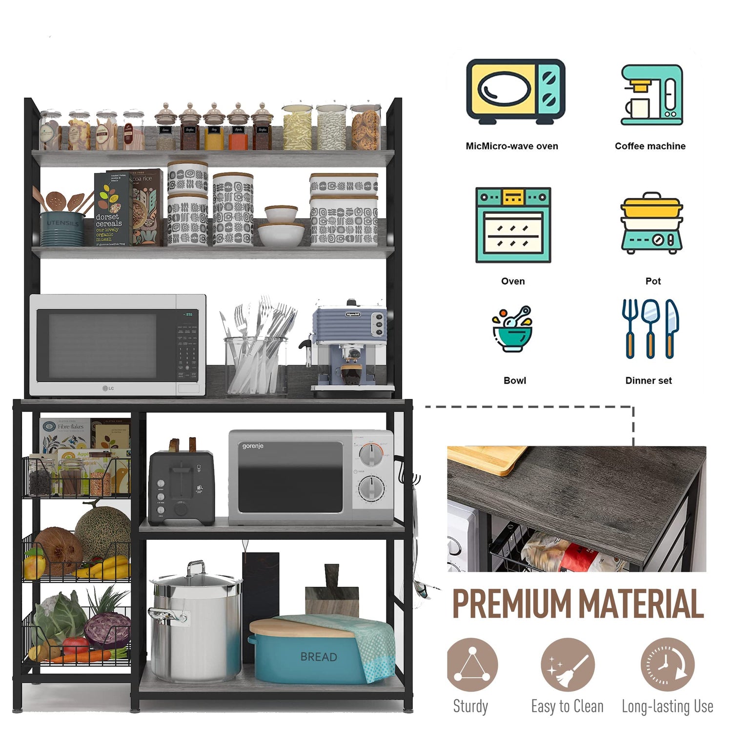- 【Industrial Style】 This Free Standing bakers rack with storage doesn’t take up too much space. It comes in vintage grey,blending industrial style and functionality, it harmonizes with all kinds of furniture decor in any room.
