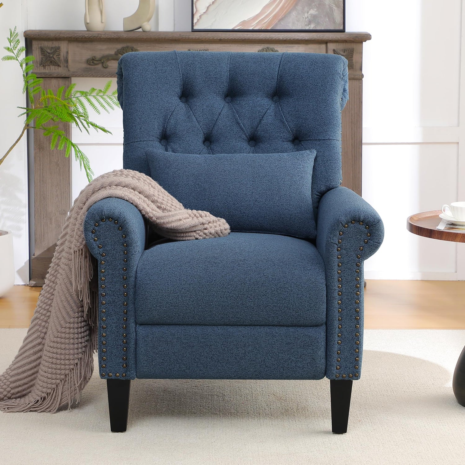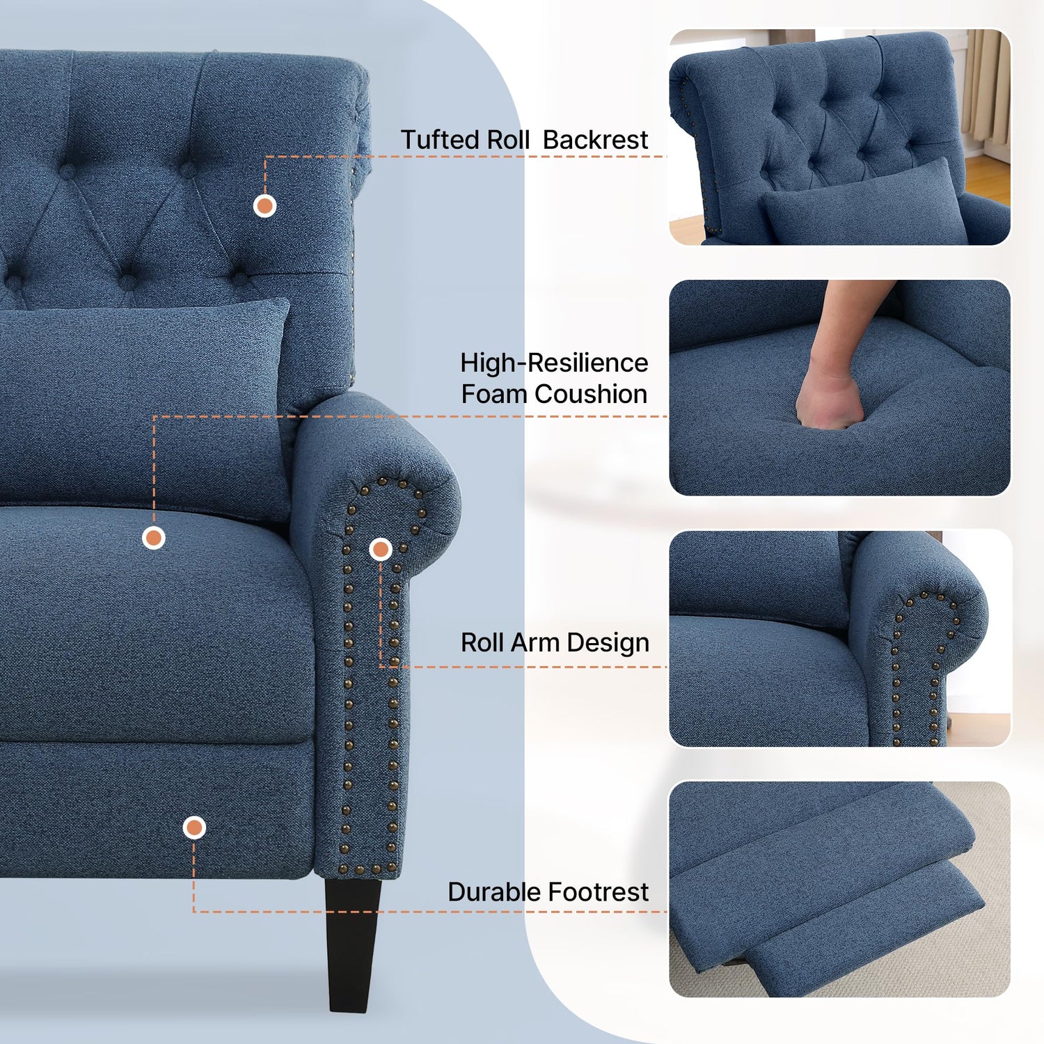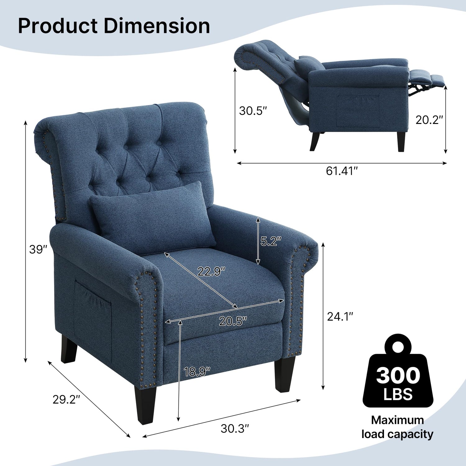 choairy Pushback Recliner Chair, Accent Push Back Chair with Adjustable Footrest Wingback, Upholstered Linen Fabric Reclining Sofa with Side Pocket, Comfy Modern Armchair for Living Room, Navy Blue