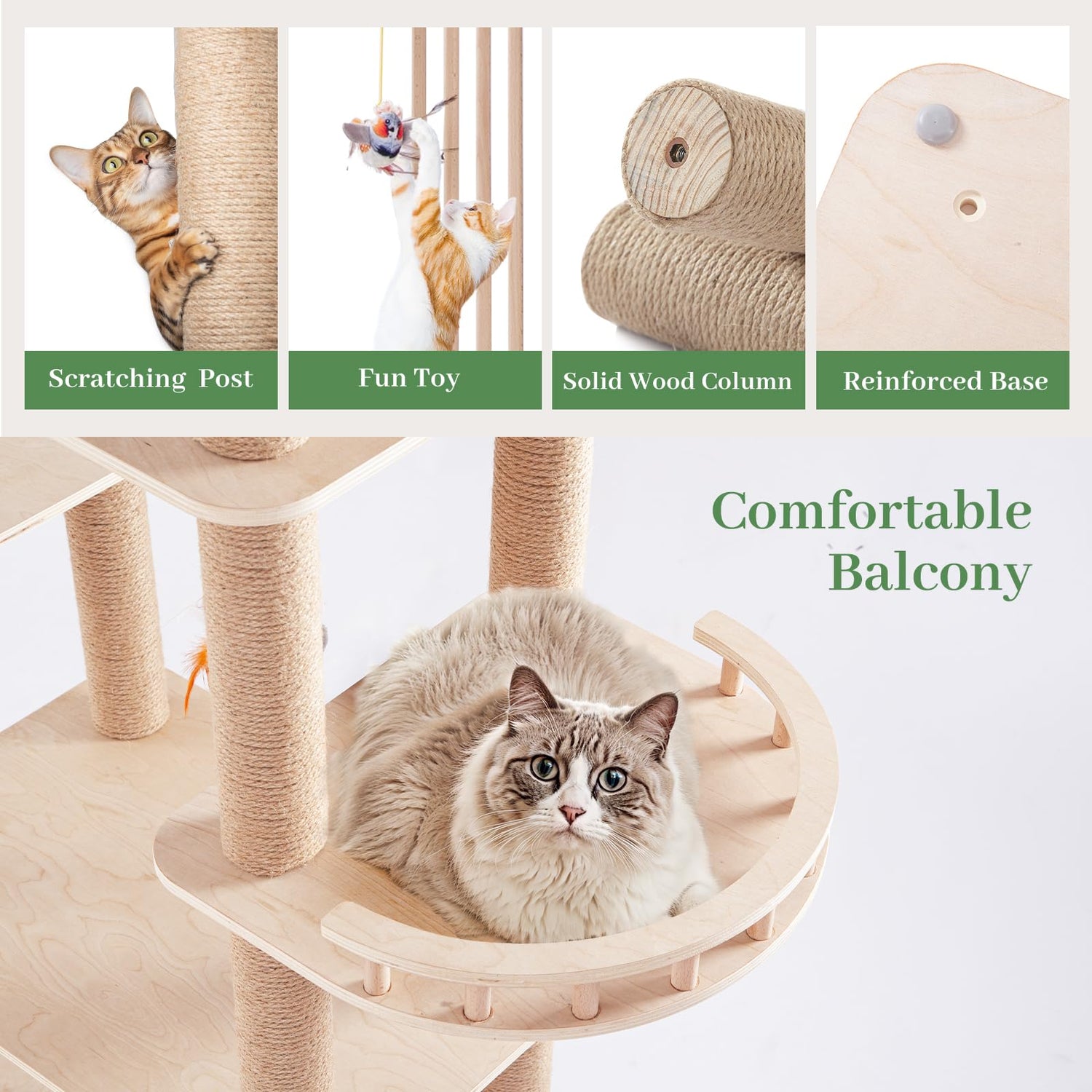 - 【Sturdiness & Stability】The cat furniture is supported by premium pine board and solid wood column. Anti-tipping belt also protect the safety of the cat. Double safety protect your cat avoid the cat condo topple.