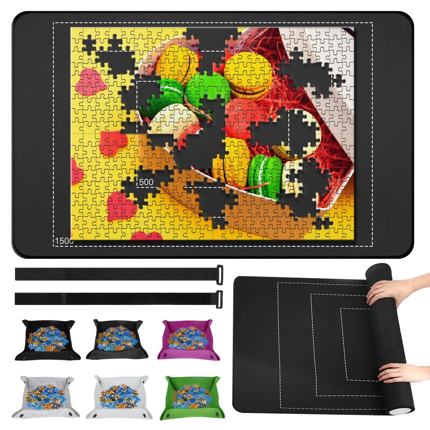 CHODEYE Premium Rubber Jigsaw Puzzle Mat, Roll Up, Saver Pad 46” x 26” Portable Up to 1500 Pieces with Non-Slip Rubber Bottom and Smooth Polyester Top + Storage Bag, 6 Colorful Trays, Rolling Tube