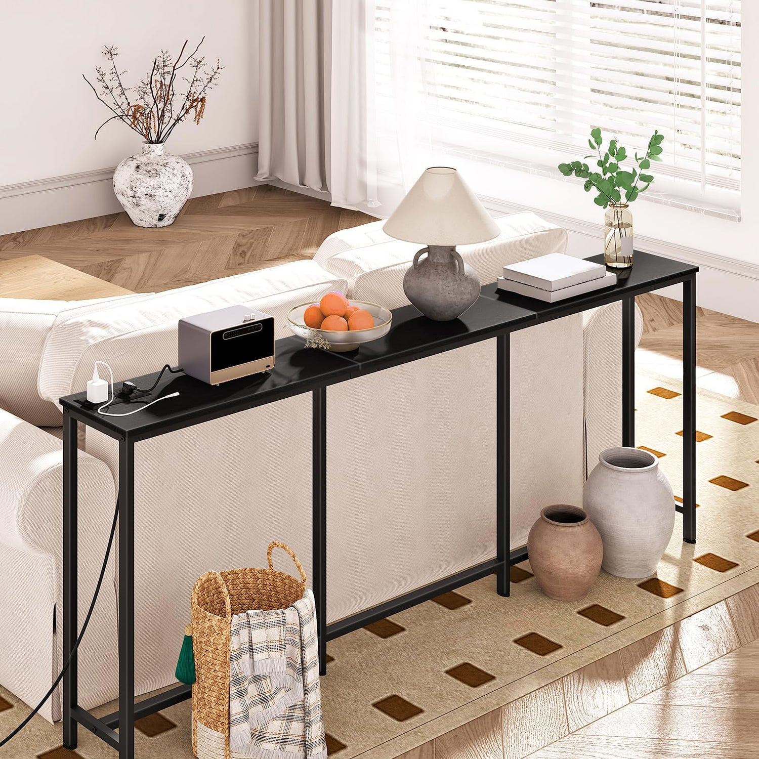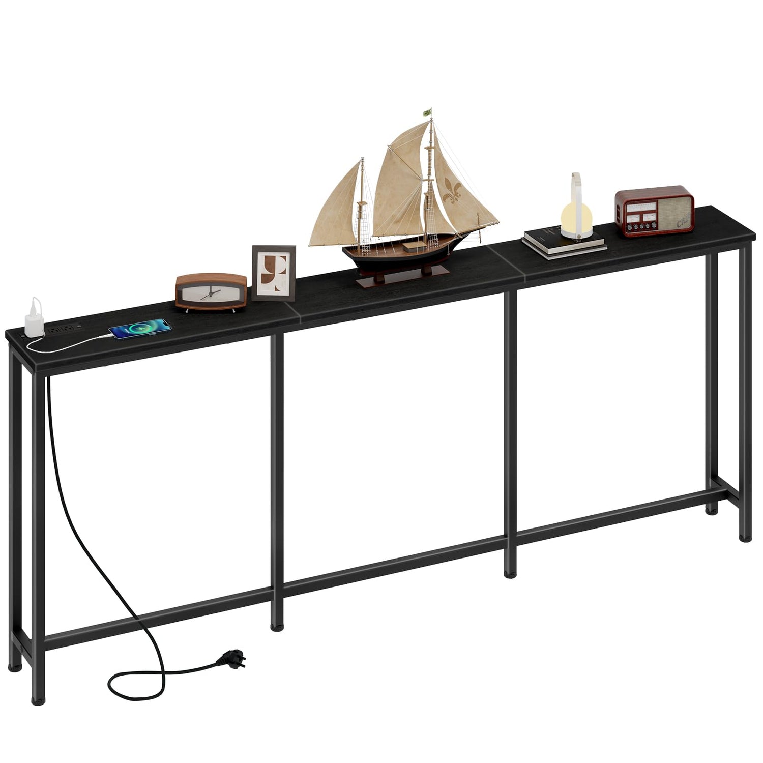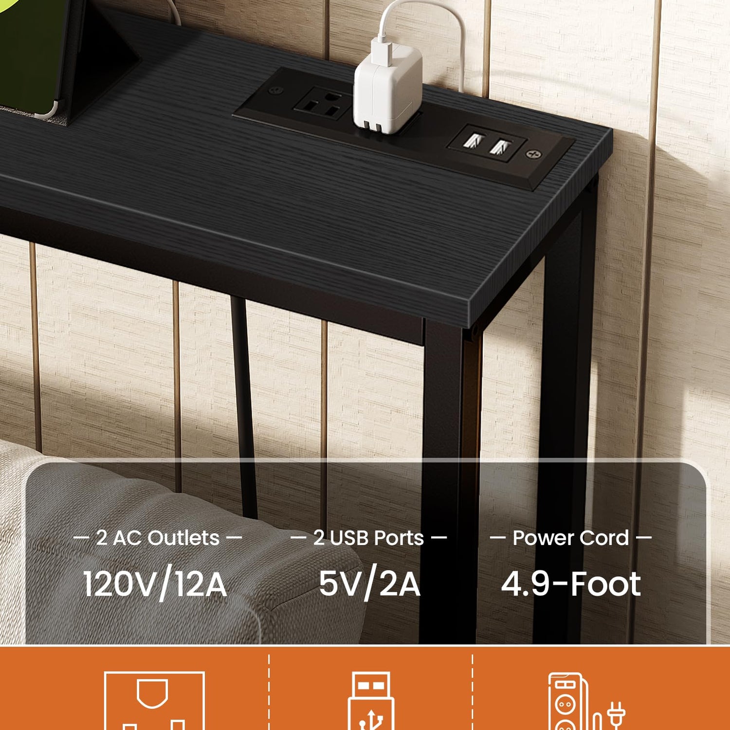 - Effortless Charging: Customize your charging experience with this sofa table's power strip, featuring 2 standard sockets and 2 USB ports. Flexibly position the outlet on the side or in the middle to suit your charging habits for convenience and accessibility
