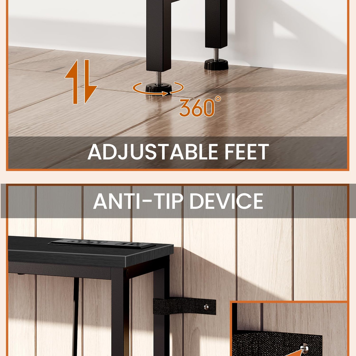- Sturdy and Stable: Crafted from high-quality particleboard and metal frame, this behind couch table is robust and reliable. 6 adjustable feet and 2 anti-tip straps keep it firmly in place and prevent it from tipping over
