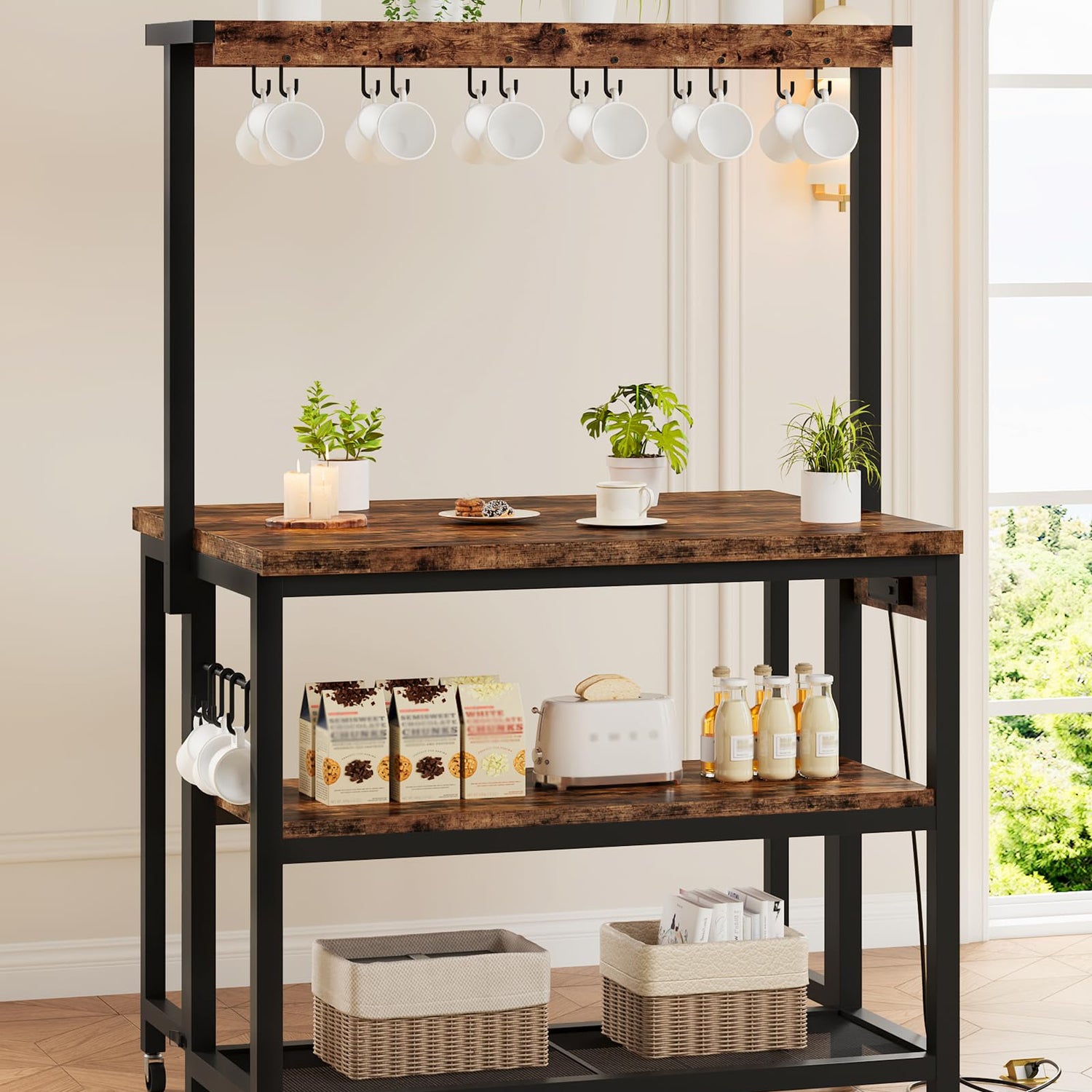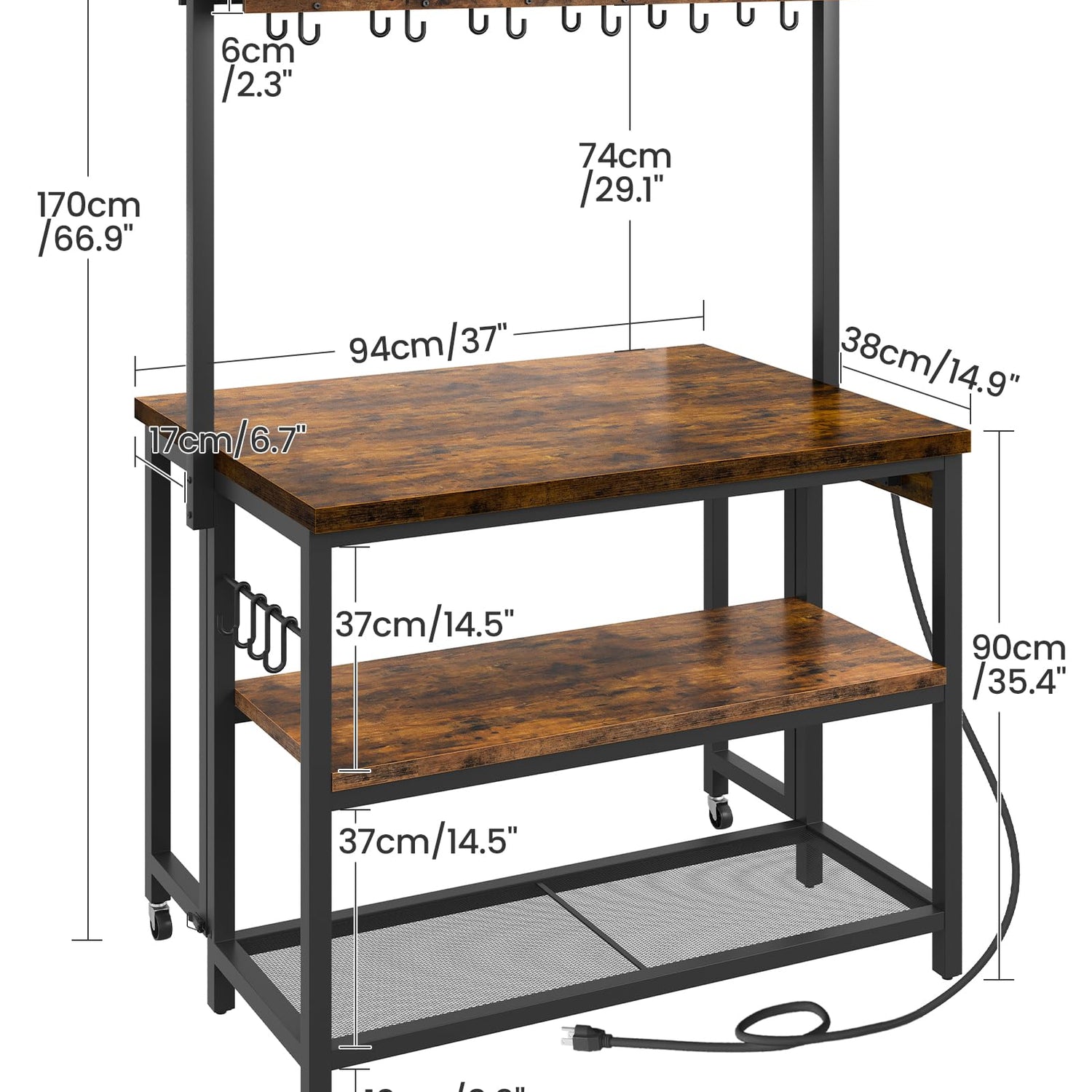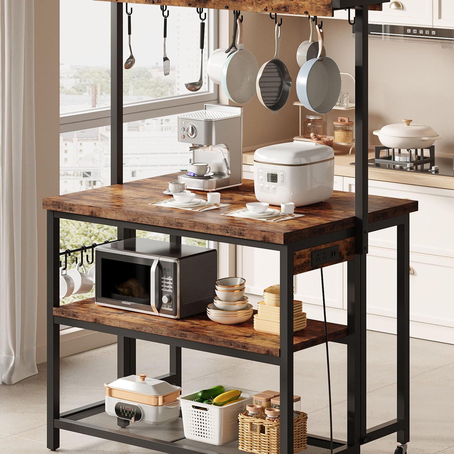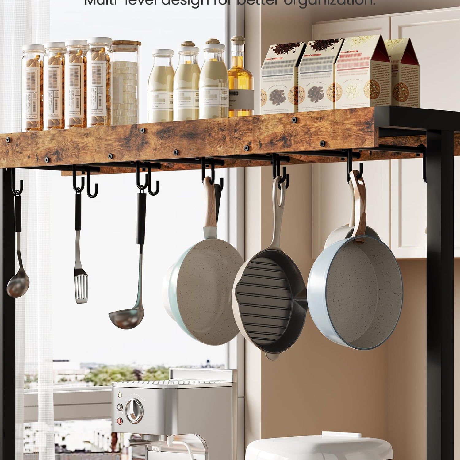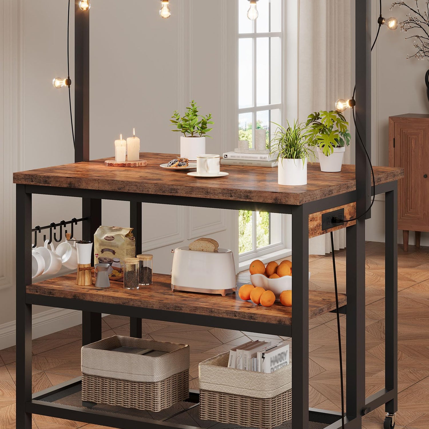 - Multi-Functional Storage Solutions: Equipped with a bottom wire mesh shelf, a middle wooden shelf, and an upper shelf with rods plus S hooks, this island table helps organize kitchen items like pots and spoons, keeping your space tidy and efficient