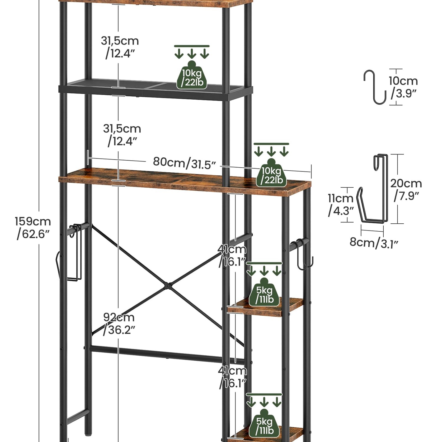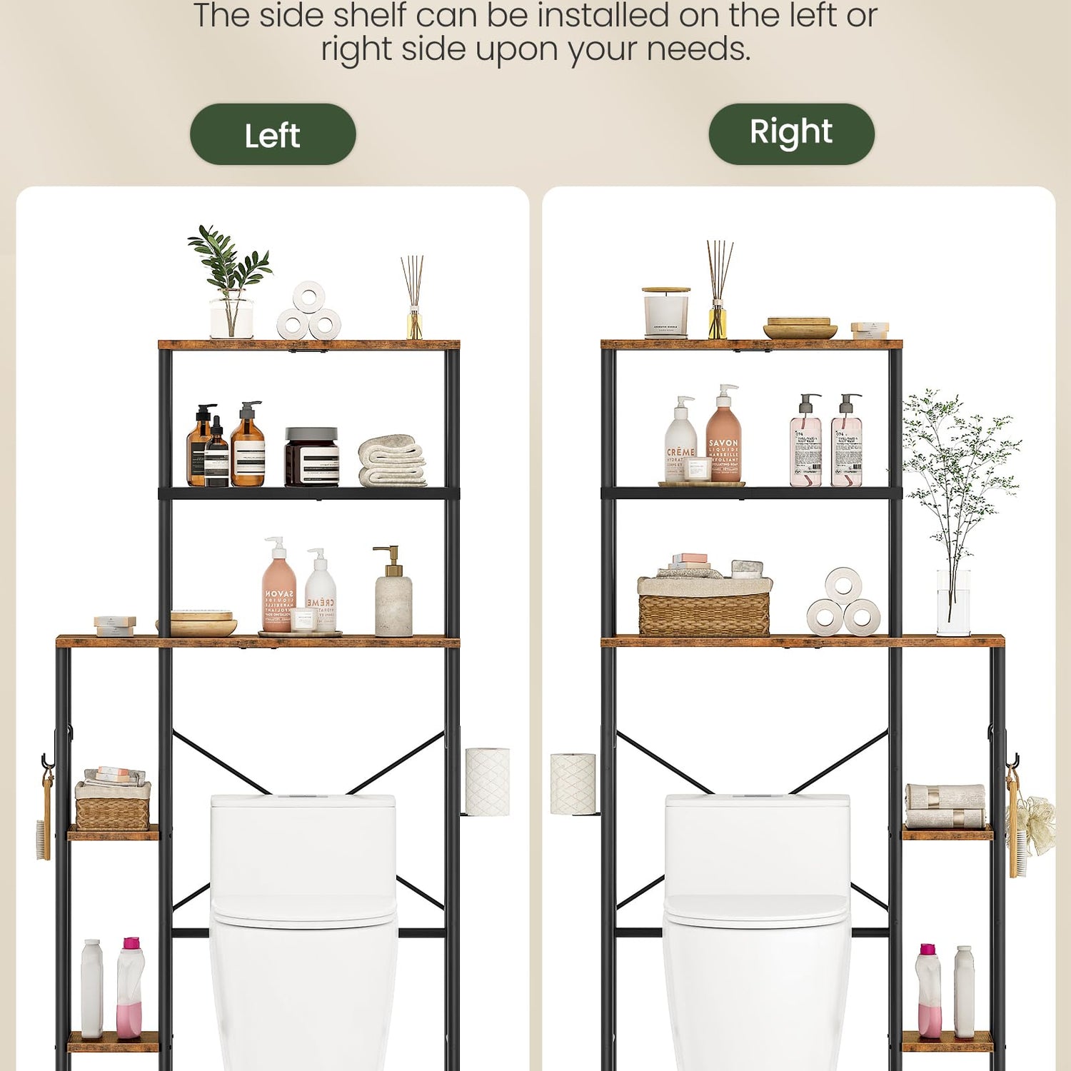 - Maximized Storage: The toilet shelf boasts a staggered partition design that maximizes storage above the toilet for items of different sizes with a tissue paper hook on the side and 2 S-shaped hooks. Adjustable left-right space suits any bathroom layout