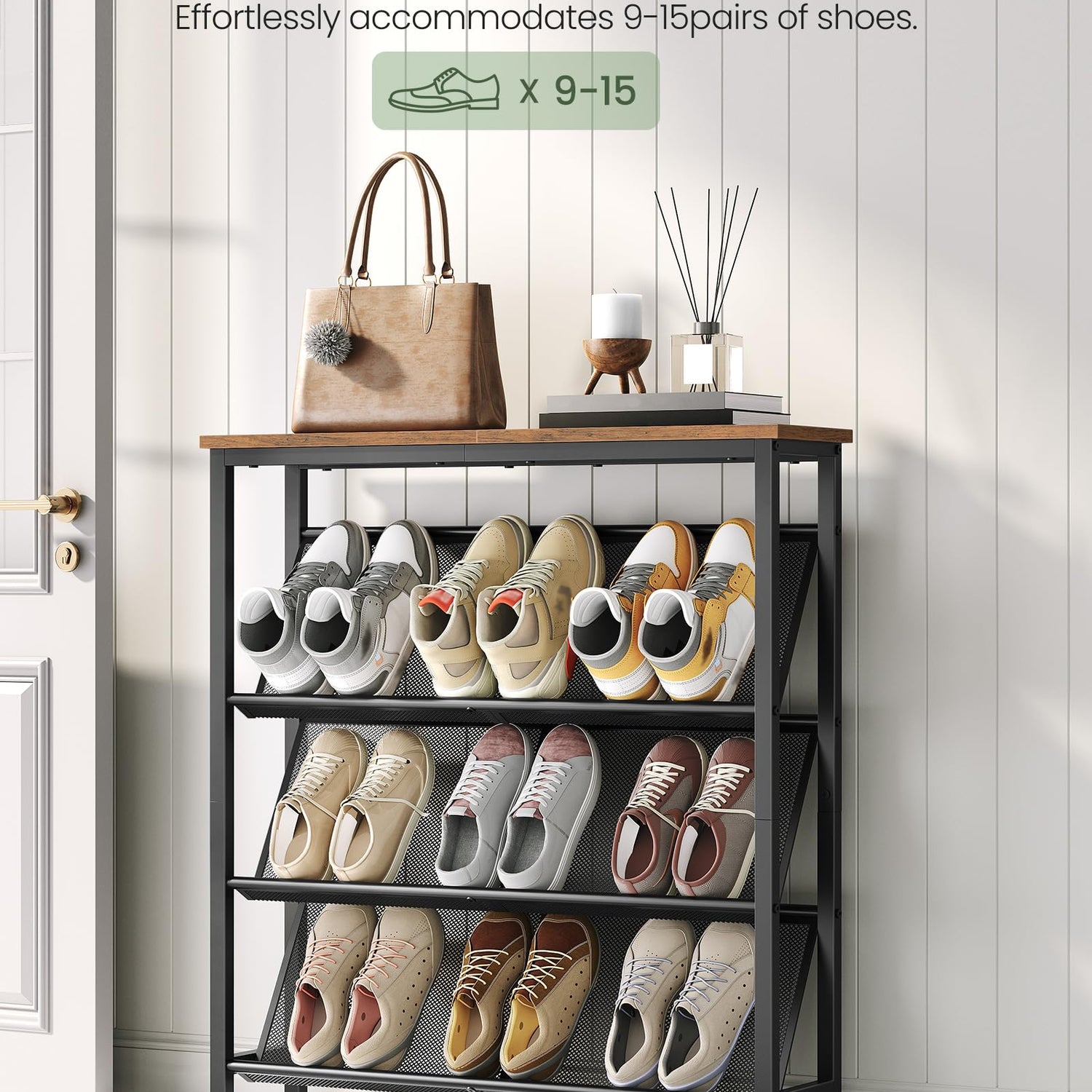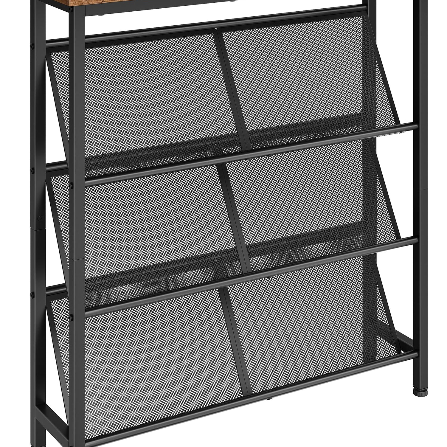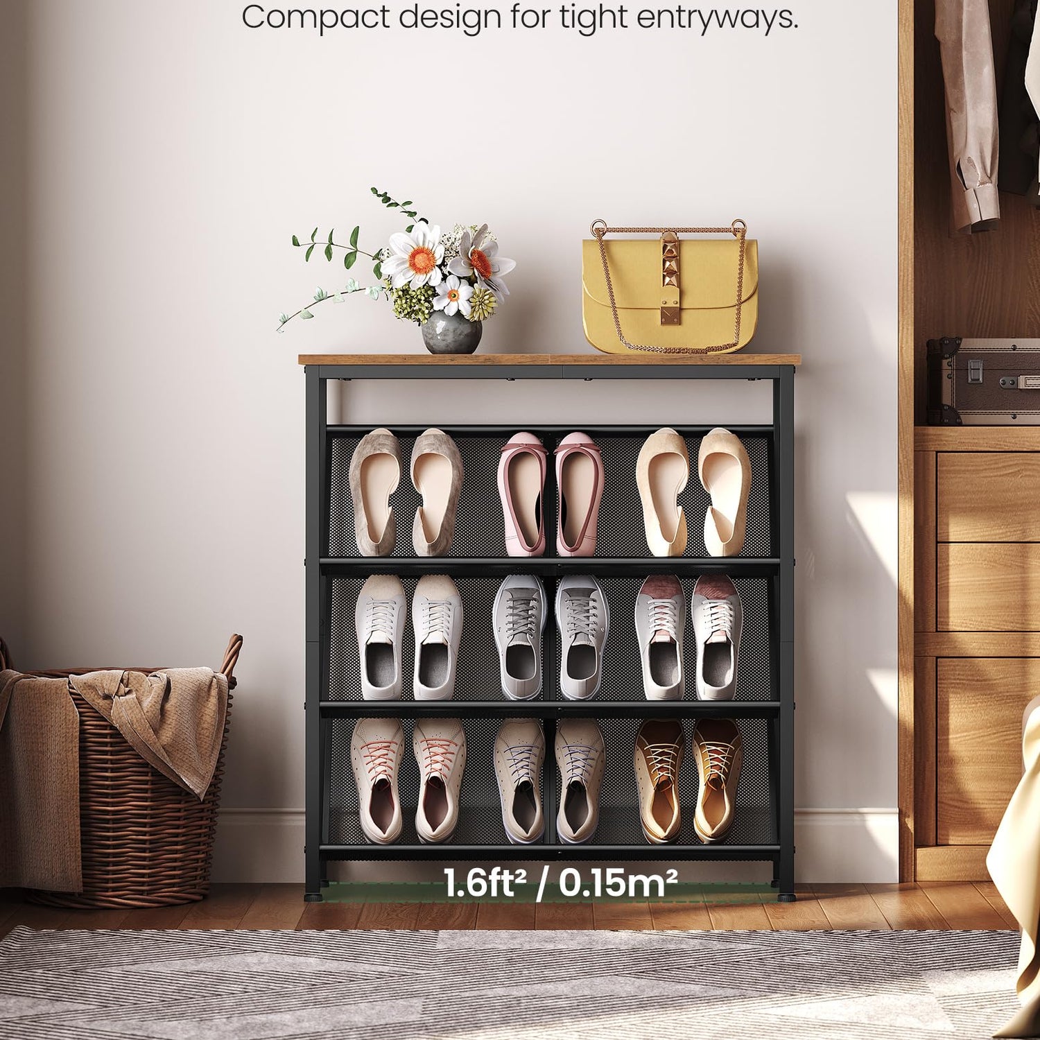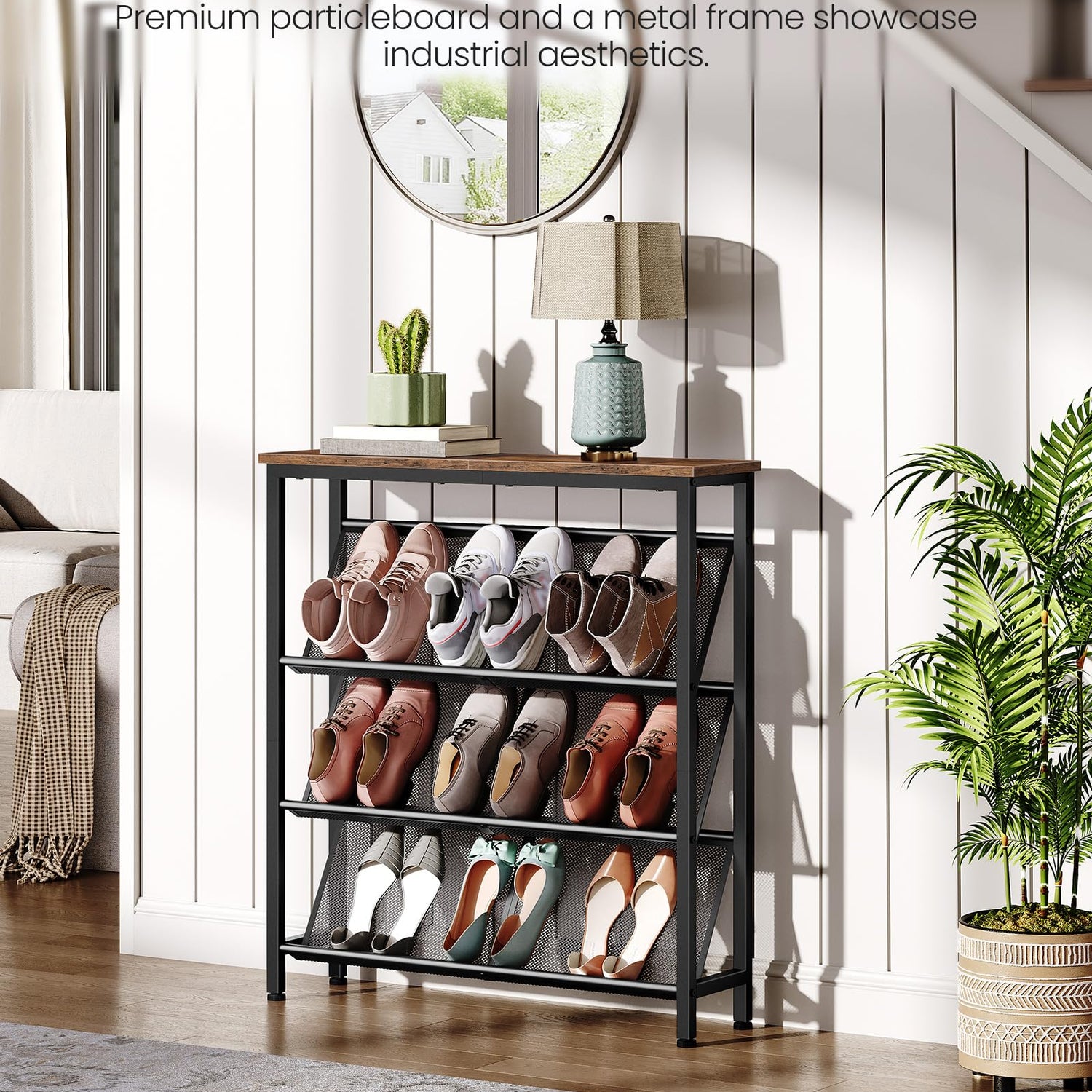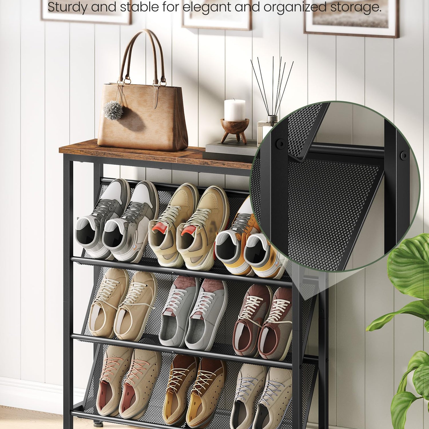 CHOEZON Shoe Rack, 4-Tier Slanted Shoe Storage Shelf, Narrow Shoe Rack for Entryway, Shoe Organizer with Adjustable Feet, Slim Shoe Shelf with Wooden Top and Metal Frame Rustic Brown and Black TXJ75BF