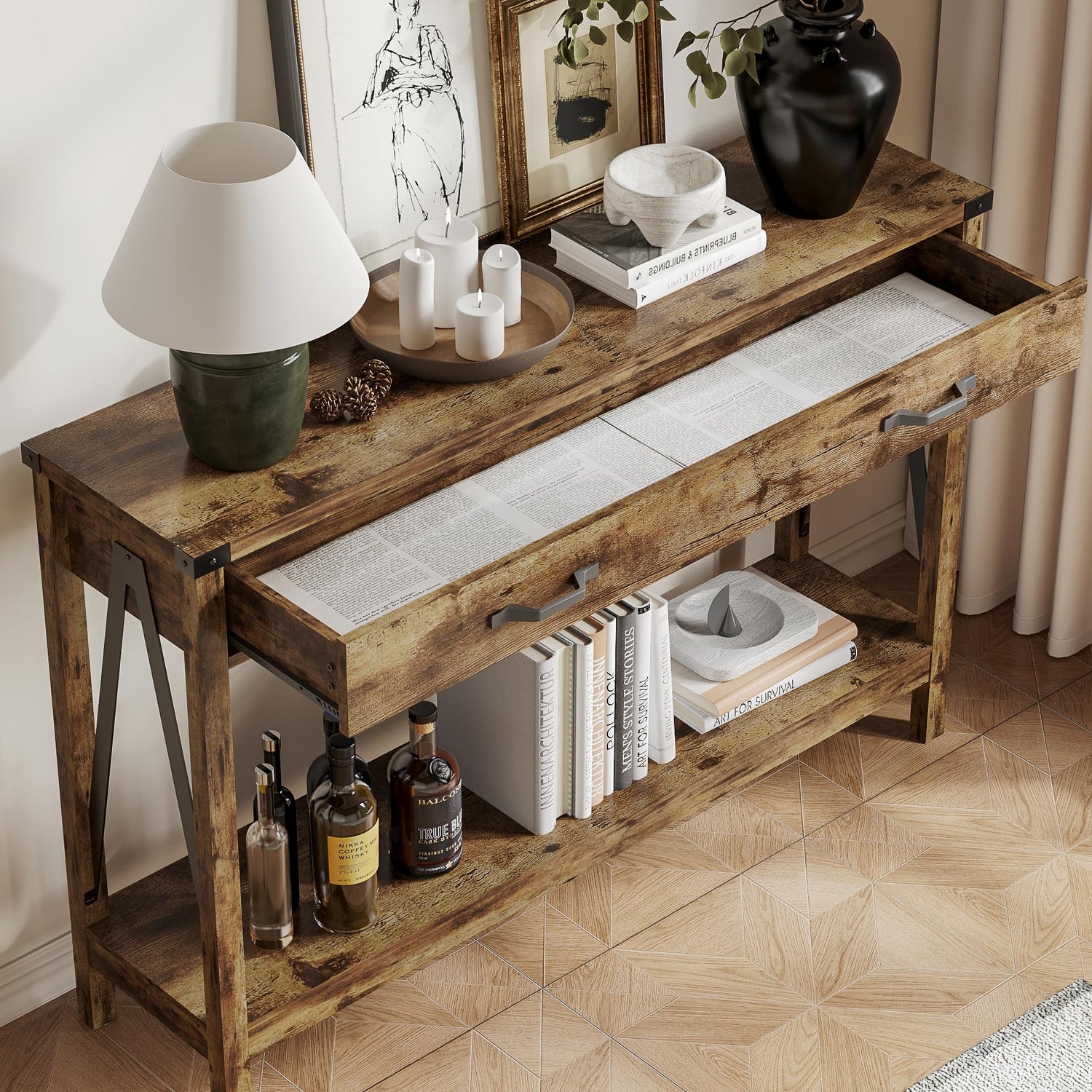 ChooChoo 47'' Farmhouse Console Table with Drawer, Entryway Table with Storage Shelf, Rustic A-Design Sofa Table for Hallway, Entrance, Living Room, Rustic Brown