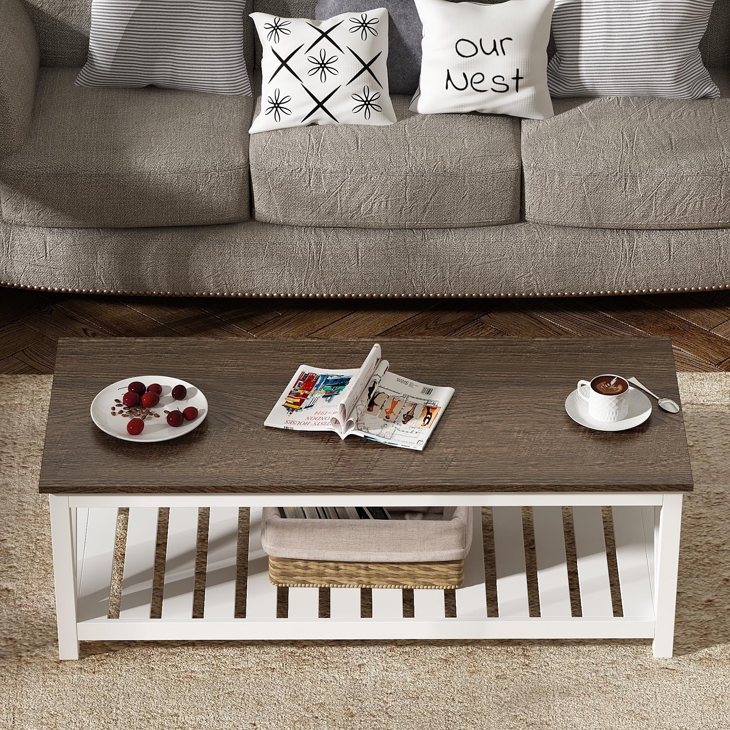 ChooChoo Farmhouse Coffee Table, Rustic Vintage Living Room Table with Shelf, 47 White