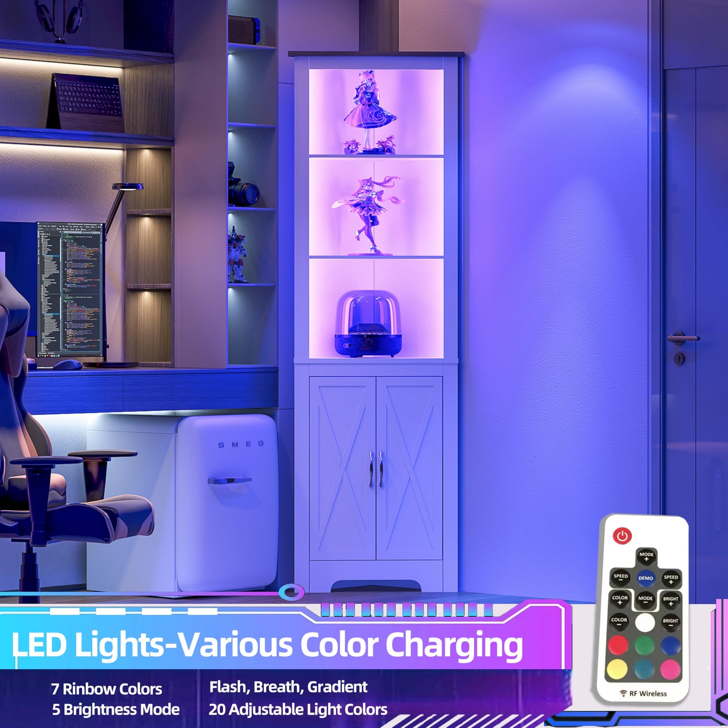 - 【 Charming LED Lights 】: Tall Corner Cabinet incorporates LED design is a new generation of fancy furniture, equipped with 20 adjustable colors, 5 brightness adjustments, and multiple light switching modes will create a dream nook. The corner cabinet with doors meets the tranquil atmosphere of rural retro style during the day, while cool lighting at night creates a relaxed entertainment and gaming