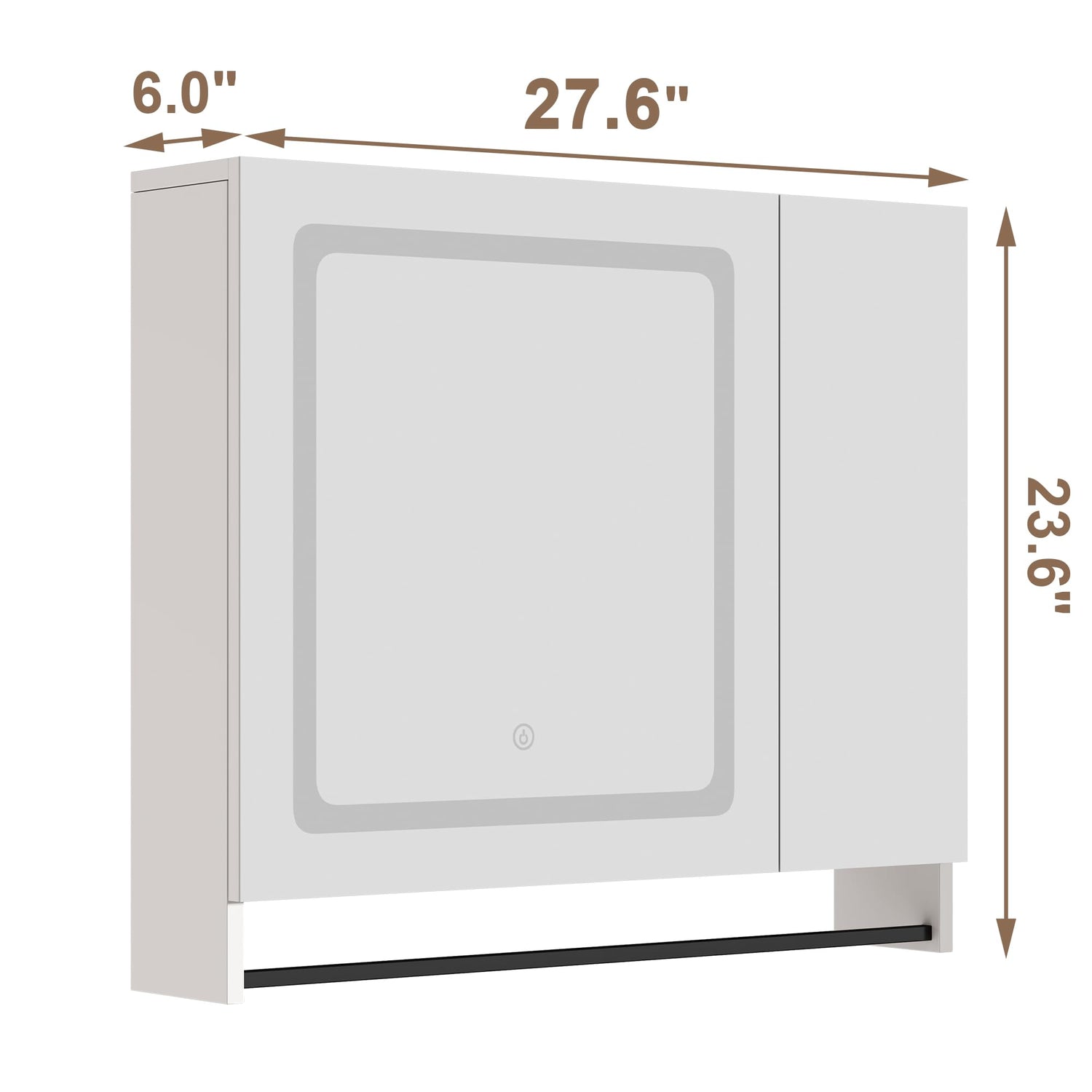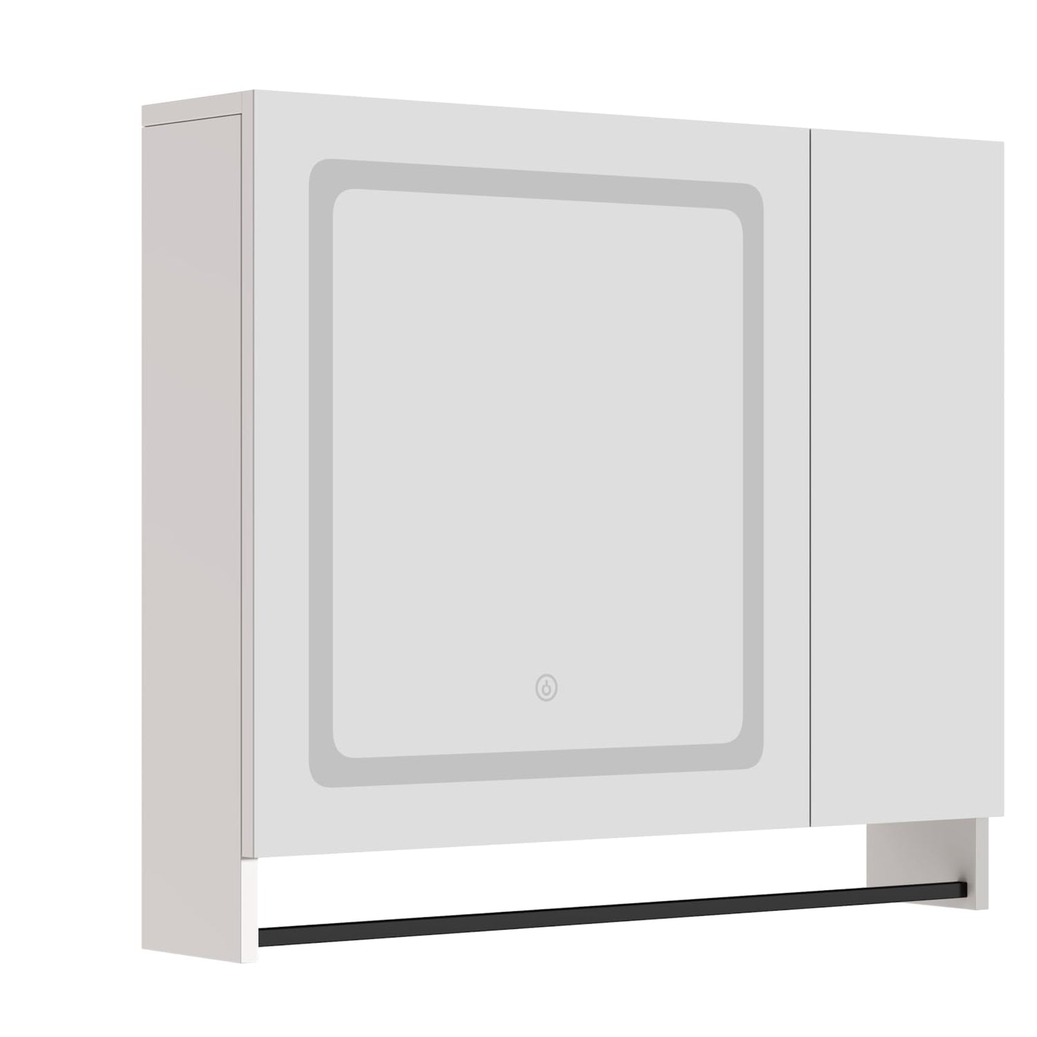 ChooChoo Lighted Bathroom Medicine Cabinet with Mirror, Wall-Mounted Bathroom Wall Cabinet with Mirror Doors, LED Lights, Adjustable Shelves, Towel Bar, White