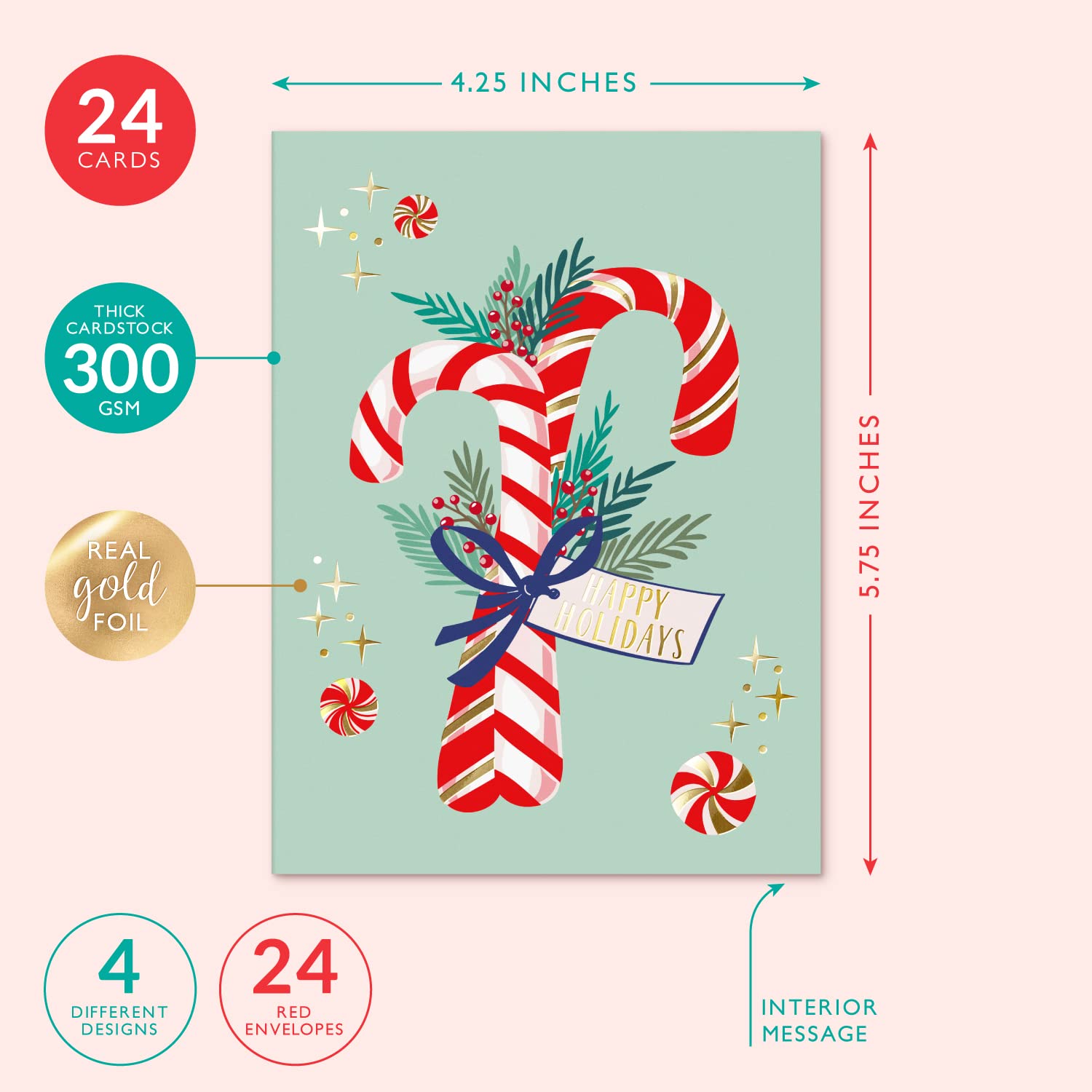 - RICH, VIBRANT DESIGN: Sure, they’re the thickest Christmas cards on Amazon; they may also be the classiest. This set contains 24 cards in 6 gold foil designs with a lovely message inside. With a set of cards like this, everyone gets to feel like you splashed out on an expensive Christmas card just for them!