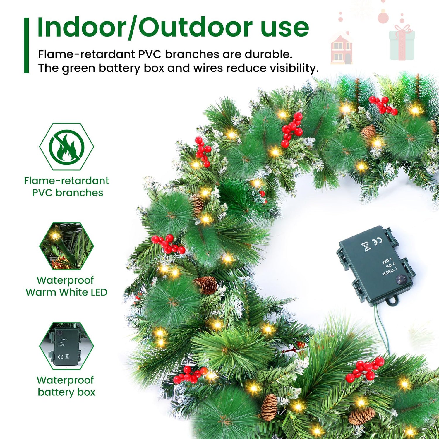 - 🎄Enchanting LED Glow: Illuminate your festivities with 50 warm LED lights. Powered by 3 AA batteries, the waterproof design ensures that this Christmas garland with light shines bright in any weather, perfect for indoor or outdoor use.