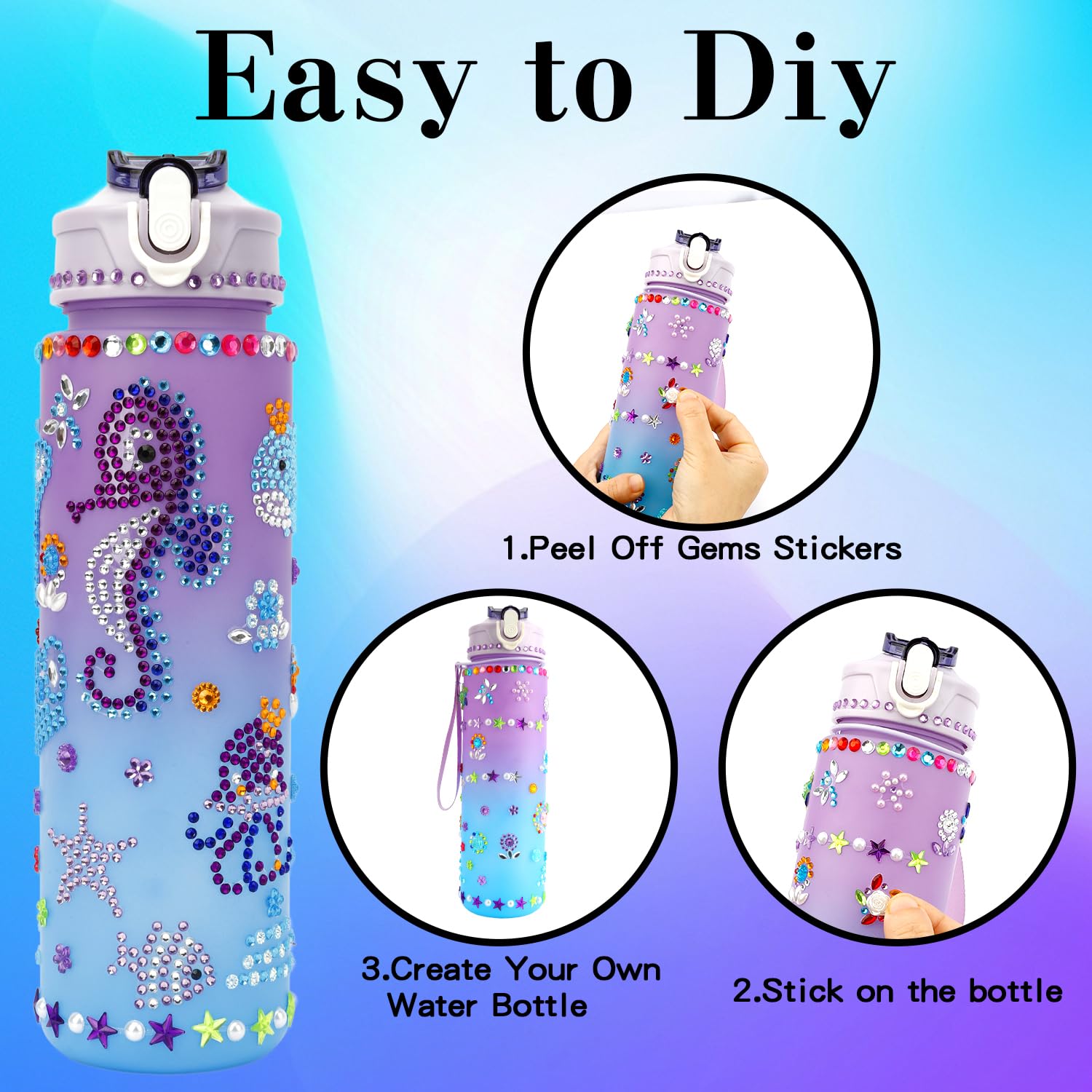 - Super Package Value: You willl get this DIY water bottles Craft Kits for girls contains 1 pc 750ml Water Bottle, 5 sheets of trendy bright diamond arts gem stickers and a beautiful box. The girls can decorate their own water bottle as they like around the themes of seahorses, dolphins, starfish, medusa, crown, flowers,butterflies etc. Let childrens to decorate create their own personalized water bottle, provide them with hours of happy time