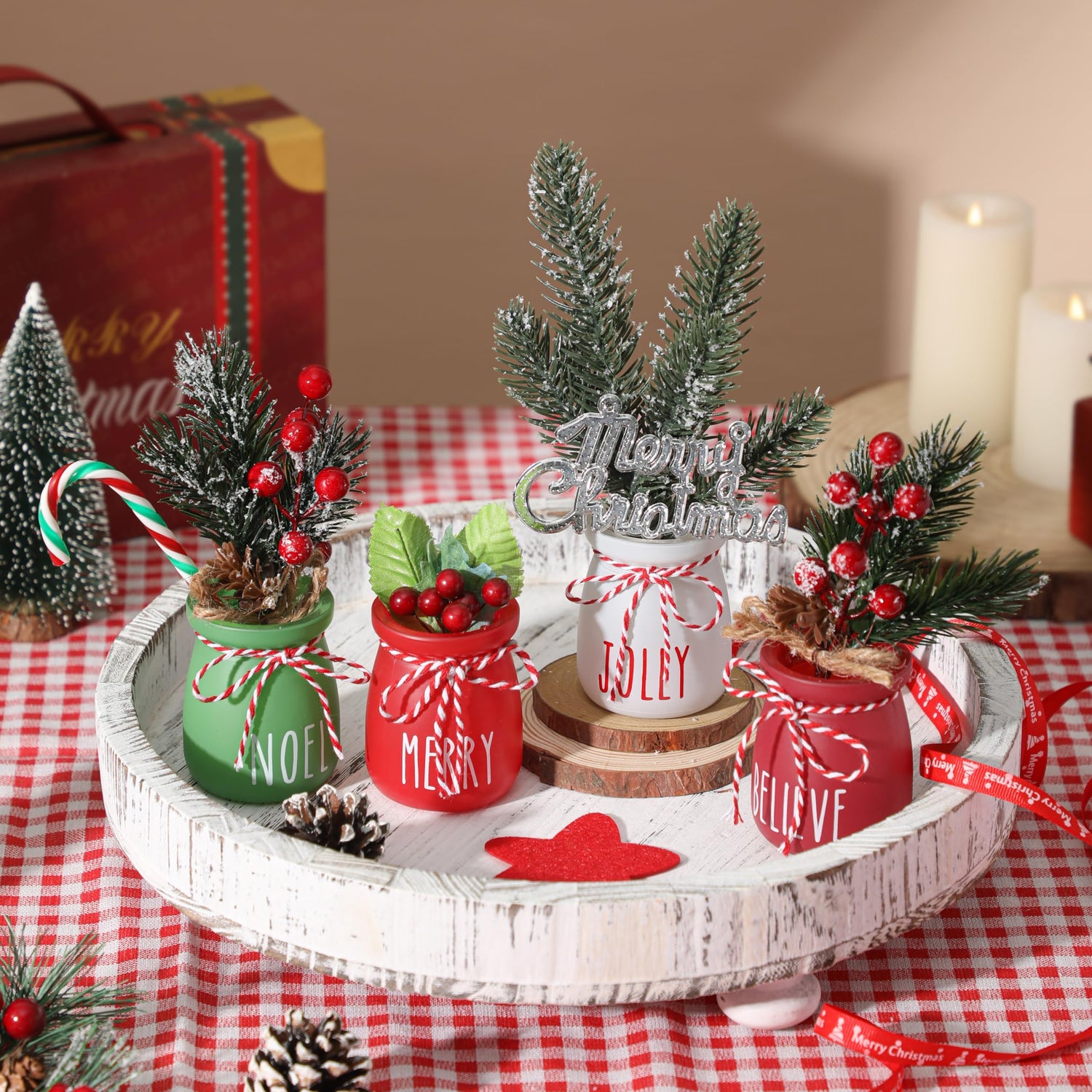 Christmas Mini Mason Jars, Winter Tiered Tray Decor, 4Pcs Holiday Farmhouse Decor Xmas Table Centerpieces Noel Merry & Jolly Decor for Home, Desk, Shelves, Christmas Gift