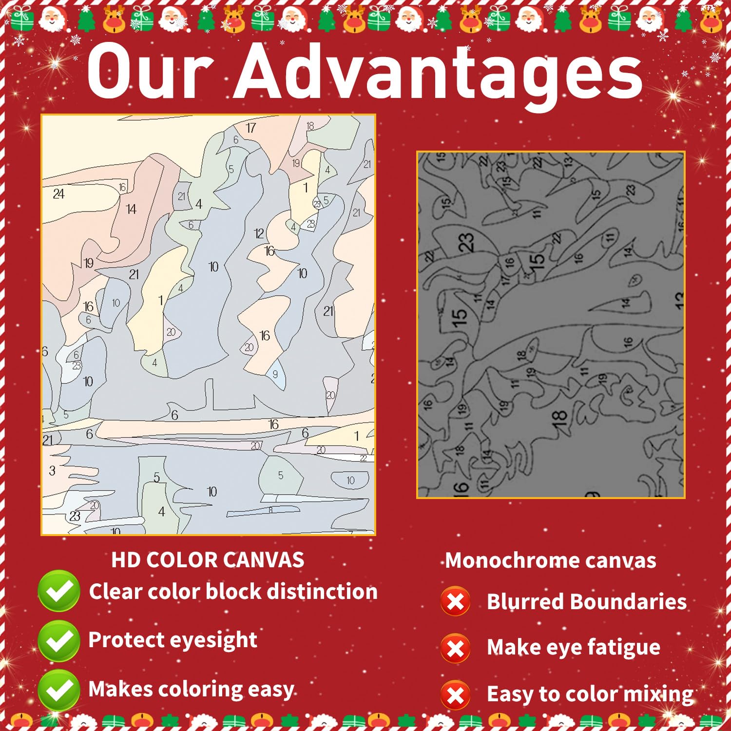 - 【Craft Your Own Painting】 DIY christmas paint by number for adults is easy and fun. Just follow the numbers on the canvas with the corresponding paint, and you will get a materspiece that is created by youself.