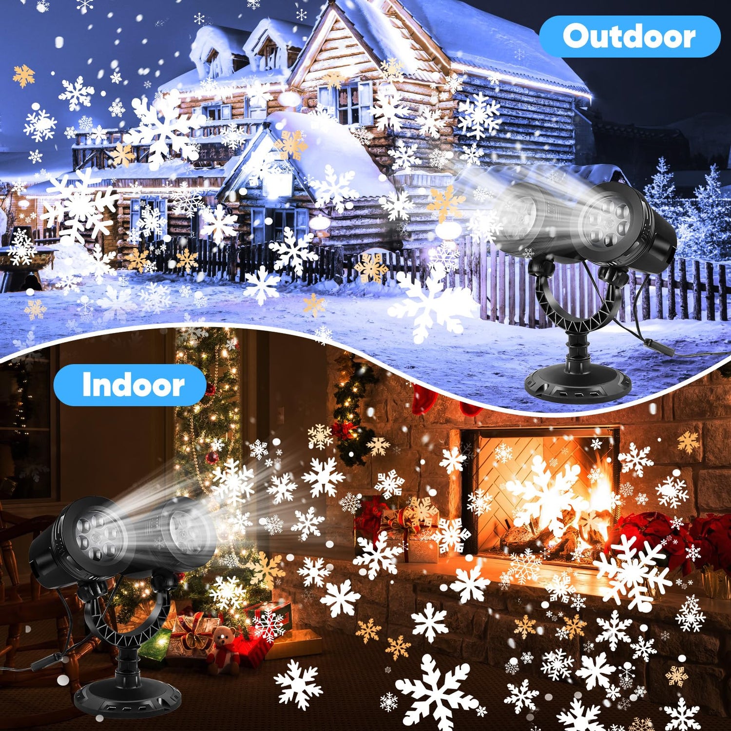 - Double Head Snowfall Lights for Christmas: This Christmas-themed double-head snowflake projector will cast 4 different dynamic snowflakes, and dual projector lights are brighter and have more coverage in snow scenes. Once you turn on the snowflake lights, you and your family will enjoy a near-realistic snow scene. The snowflake motion pattern is perfect for Christmas!