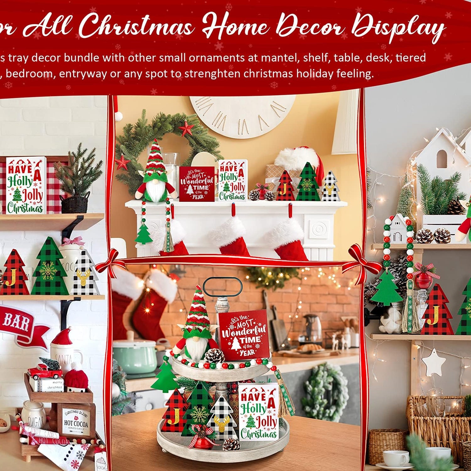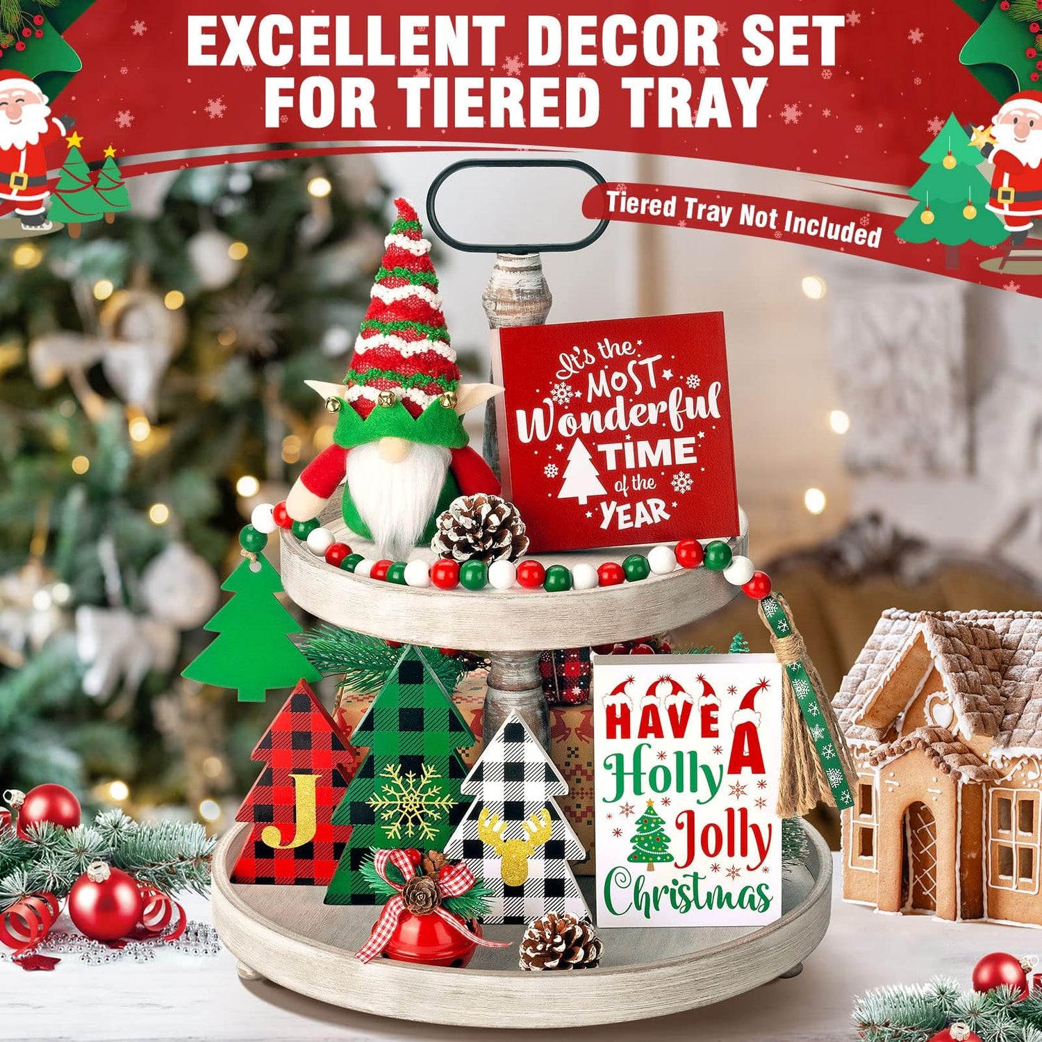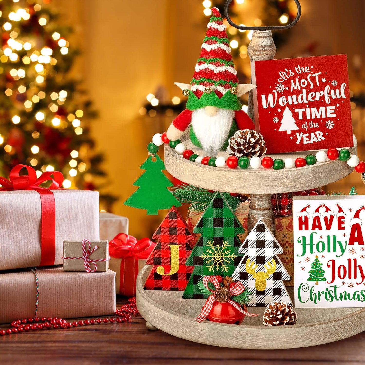 - ALL-IN-ONE 10 PCS Christmas Tiered Tray Decor: Are you tired of running all over to find small Christmas item for home decor one by one? Tiblue farmhouse Christmas decor includes 1 Christmas gnomes plush, 2 Wooden Christmas Signs, 3 Christmas tree sign, 1 wood bead garland, 1 Christmas bell, 2 pine cones, that will meet all your Christmas DIY Decoration needs! The Christmas table decoration can be perfectly matched with other small christmas tray items or winter elements (Tray not included)