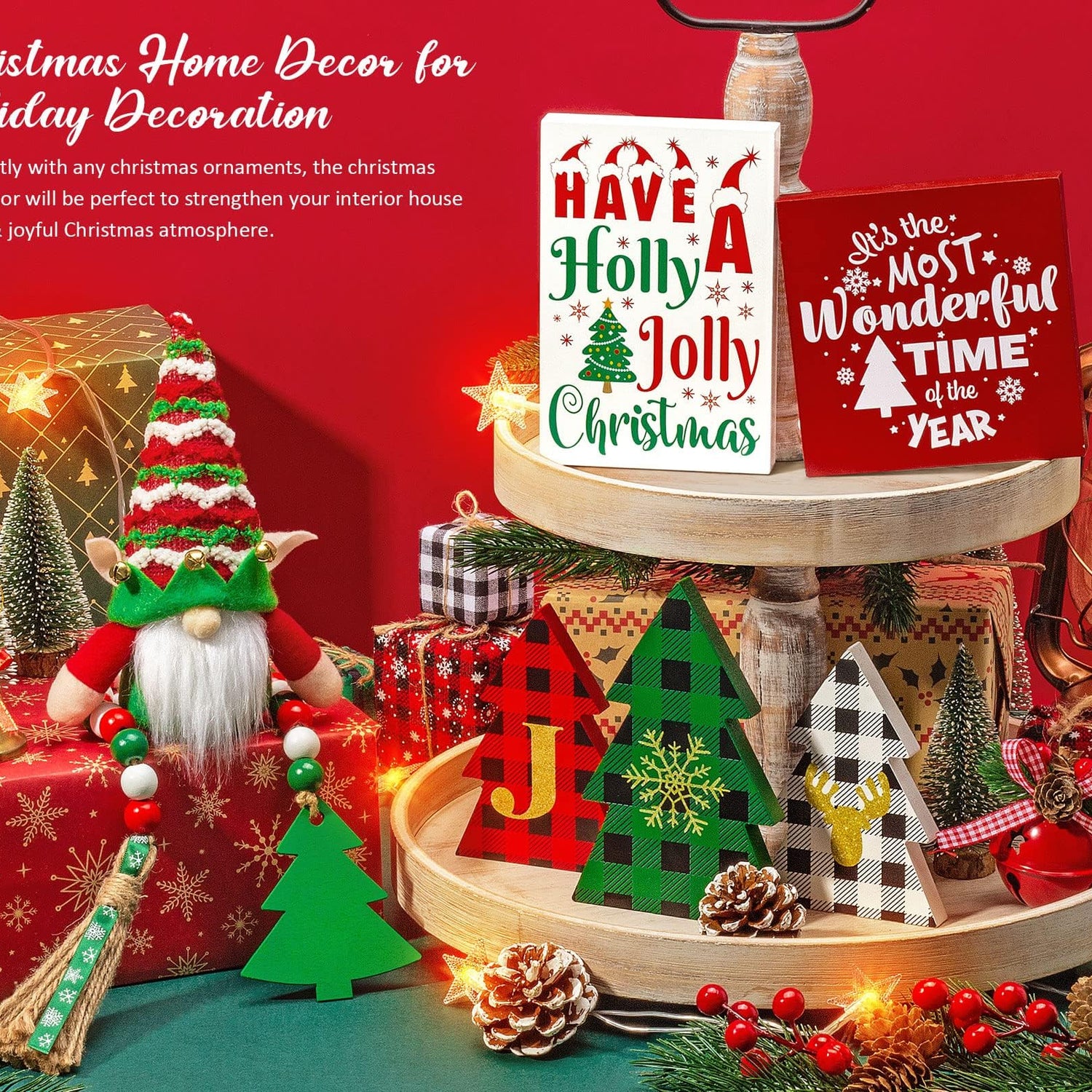 Christmas Tiered Tray Decor 10 PCS Christmas Decorations for Home - Christmas Table Decor Wooden Signs & Christmas Gnome Plush Set - Farmhouse Christmas Tray Decor Kitchen Table Mantel Christmas Party