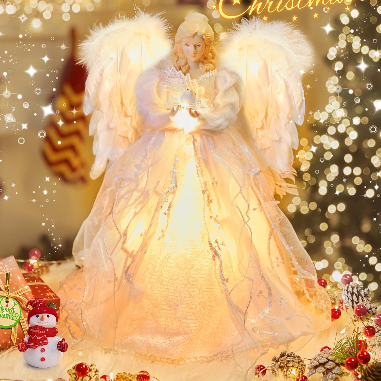 Christmas Tree Topper Angel with Lights, Xmas Tree Toppers Decorations Ornament with White Feather Wings, Plug in Christmas Tree Angel Treetop for Indoor Office Holiday