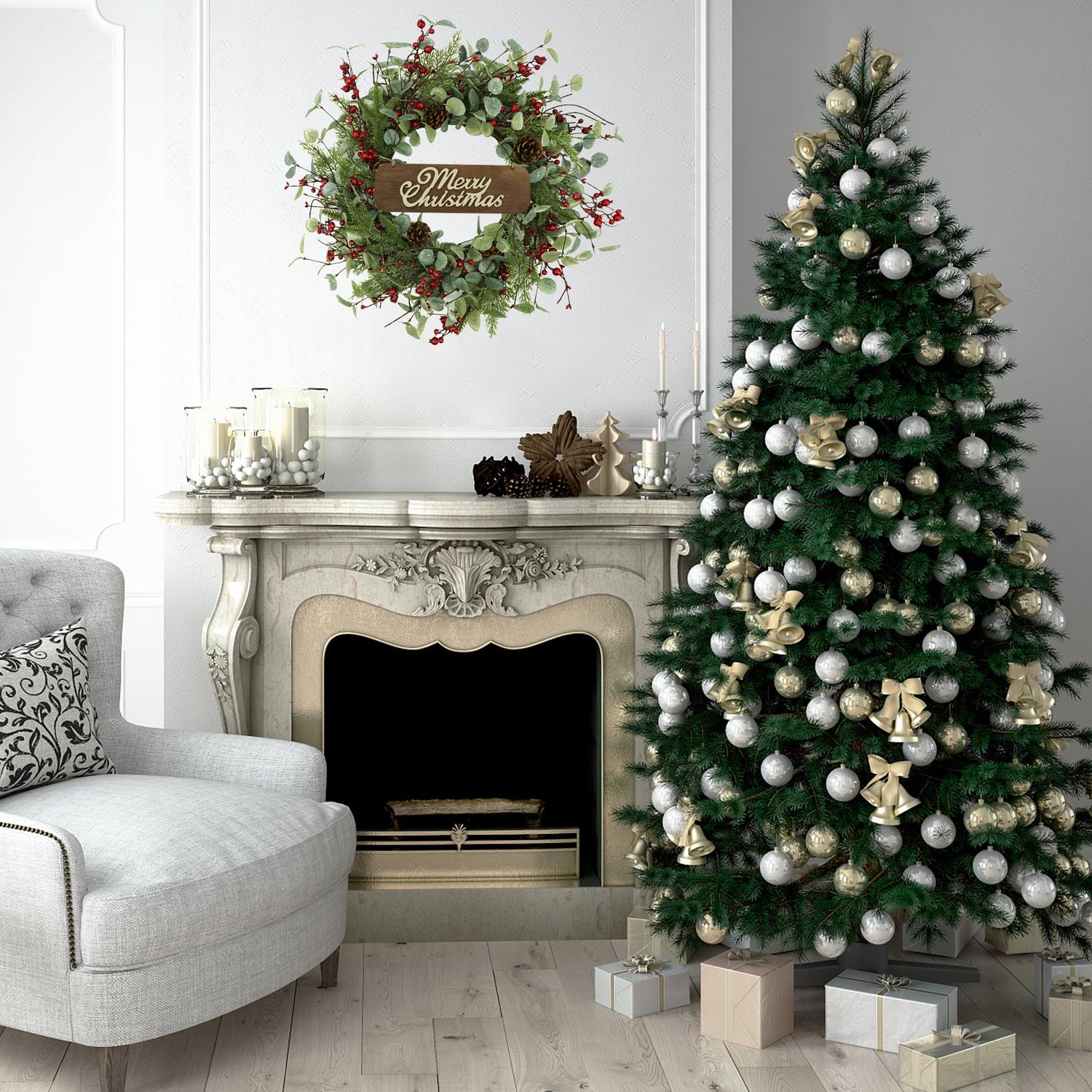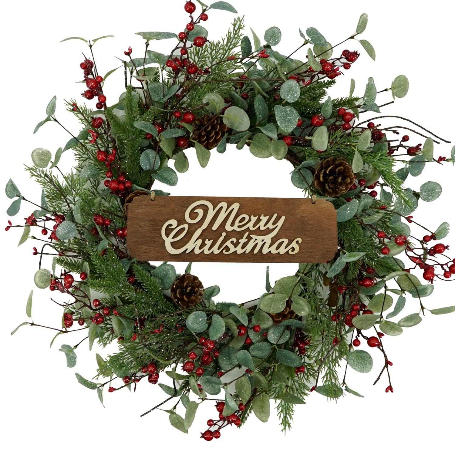 Details: christmas wreath, artificial christmas wreath with Sparkling leaves and pine needles are paired with plump pine and red berries,wreath for front door indoor wall window decor.