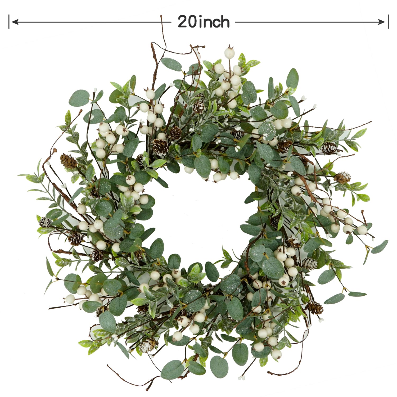 - Handmade wreath: This Christmas wreath is designed for door and wall decoration; Real branches and pinecones are complemented with rich white berries and dotted silver sequins to give you a completely natural plant look, giving you green all year round