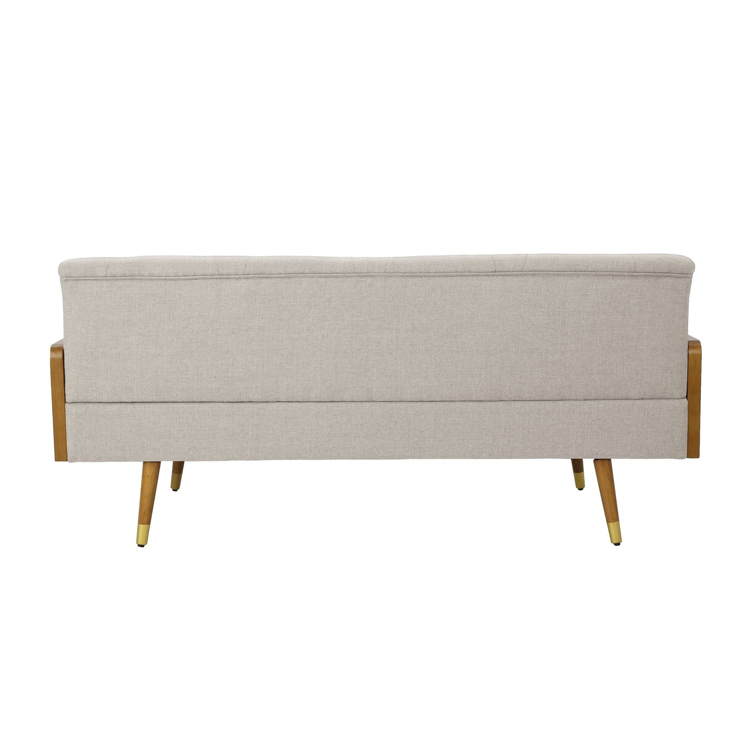 Details: Anchor your living room in sophisticated style and impeccable comfort with a single addition. Perfectly balancing wood accents with fabric upholstery, our impressive sofa set offers your home a charming mid-century modern upgrade. This piece offers a beautiful button tufted design that is finished with diamond stitching in the backrest and waffle stitching in the seating. Completed with iconic splayed legs with gold tips and lovely rolled accent pillows, this refined sofa will make any interior space into a stunning masterpiece. Includes: One (1) Sofa Material: Fabric Leg Material: Birch Multiple Color Options Leg Finish: Dark Walnut Hand-Crafted Details Assembly Required Dimensions: 30.50 inches deep x 72.25 inches wide x 32.25 inches high Seat Dimensions: 21.75 inches deep x 69.25 inches wide x 18.25 inches high