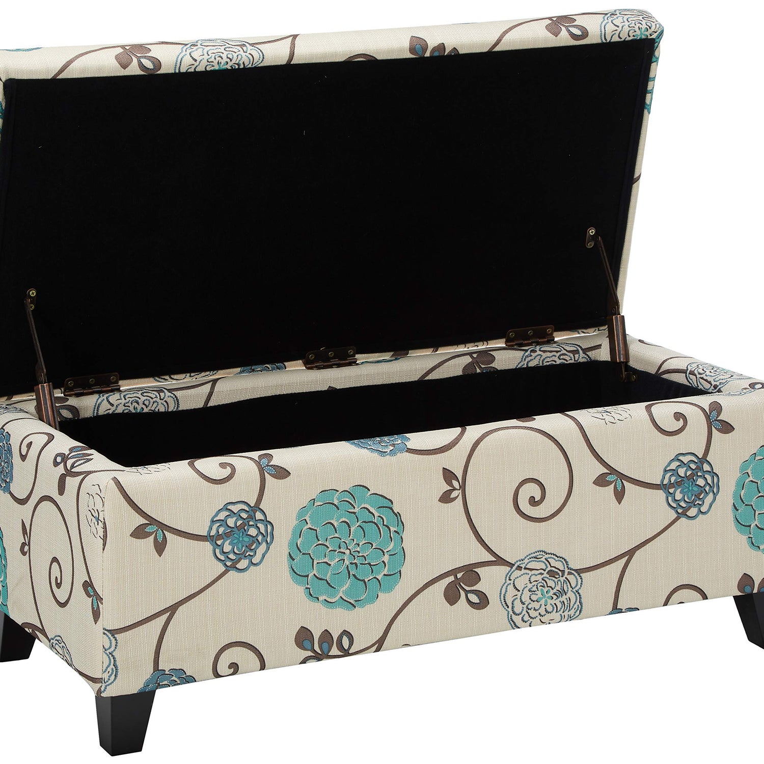 Details: Enjoy this charming storage ottoman in your home today. Perfect for your living room, office, or bedroom, this ottoman boasts convenient storage space that is ideal for those extra board games or pillows you have lying around. With a lovely upholstered look and soft pressure hinges, this ottoman not only brings a touch of class to your interior decor but also much-needed storage space. This ottoman will tie your home together with extra seating and stunning looks, making this the ideal addition for your space. Includes: (1) Storage Ottoman Material: Fabric Composition: 100% Polyester leg material: Birch color: White and blue floral leg finish: Dark brown hand-crafted details assembly required dimensions: 19.25 inches deep x 39.00 inches wide x 16.50 inches high.