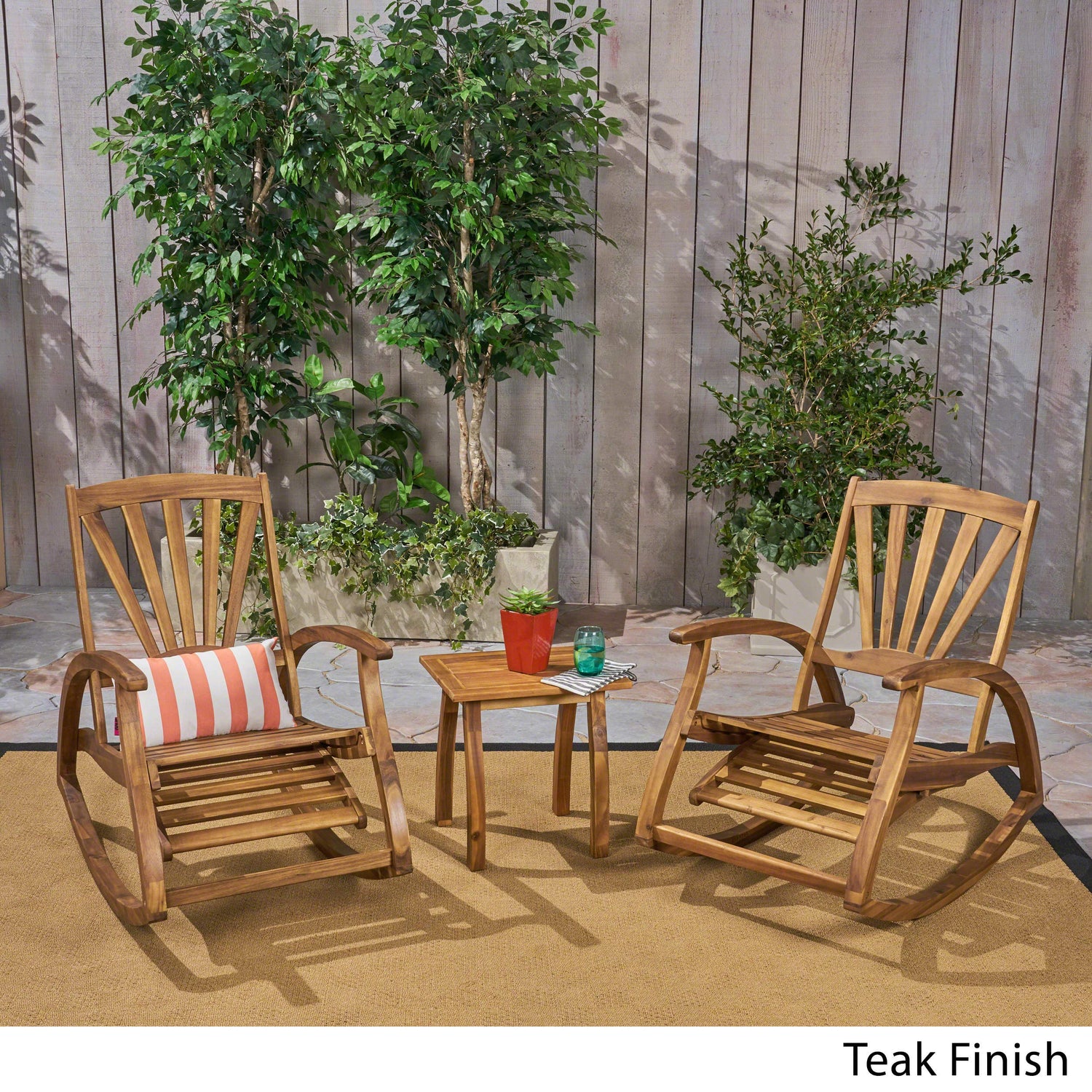 Details: No porch or patio area would be complete without somewhere to hide away from the world with your favorite person - this set of two reclining rocking chairs with included accent table provides a comfortable seating arrangement suitable for even the most modest of outdoor living spaces. All three pieces feature solid acacia wood frames, each sporting an attractive and modern slatted wood motif. The shared side table boasts smooth, elegantly-curved legs that match the twin chairs' carved arms perfectly.