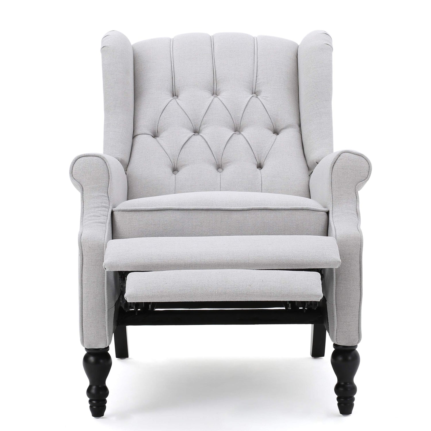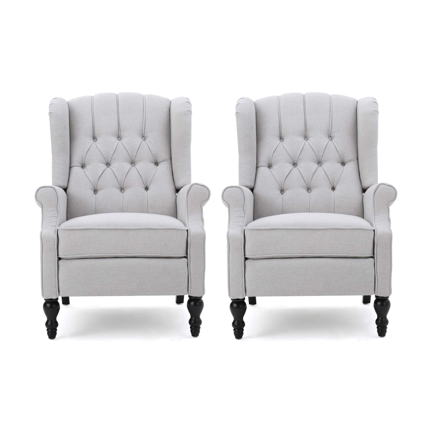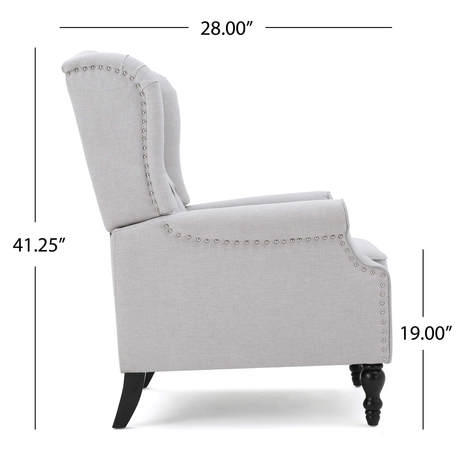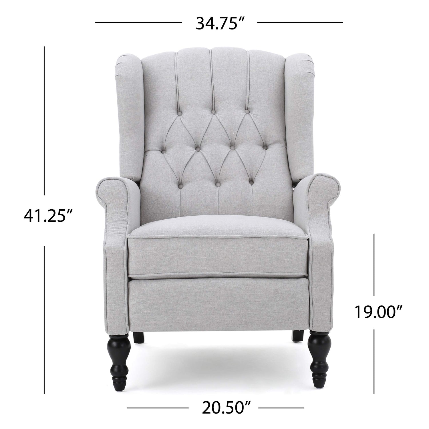 Details: Luxurious comfort and refined style are at your fingertips with our timeless recliner. Sure to bring your interior space a stunning upgrade, our armchair uses a smooth pushback reclining mechanism and carefully crafted accents to tie your home together with absolute sophistication. This pushback recliner features gorgeous details such as button tufting, diamond stitching, tonal piping, and an outstanding studded trim to bring your decor to the next level. Finished with a lovely wingback design and rolled recessed arms, our recliner is as stylish as it is functional. Includes: Two (2) Recliners Material: Fabric Fabric Composition: 100% Polyester Leg Material: Birch Color: Light Gray Leg Finish: Dark Brown Assembly Required Dimensions: 34.50 inches deep x 28.50 inches wide x 41.00 inches high Extended Dimensions: 62.00 inches deep x 28.50 inches wide x 29.00 inches high Seat Dimensions: 21.00 inches deep x 20.00 inches wide x 19.25 inches high Arm Height: 24.75 inches
