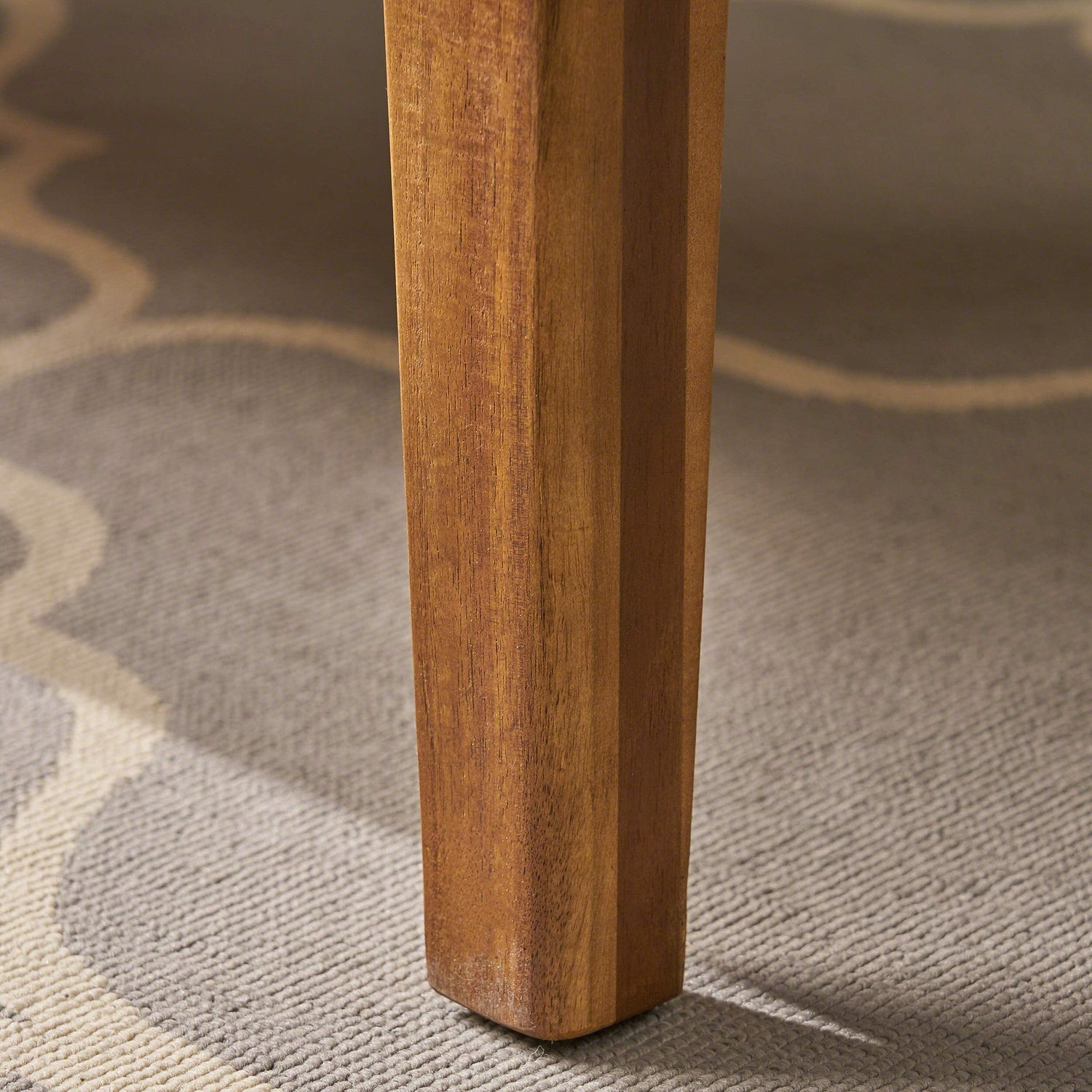 - Includes: one (1) right-side Armrest, one (1) left-side Armrest, one (1) armless piece, one (1) ottoman, one (1) Coffee table. Frame material: Acacia wood. Cushion material: water-resistant fabric. Fabric composition: 100% polyester