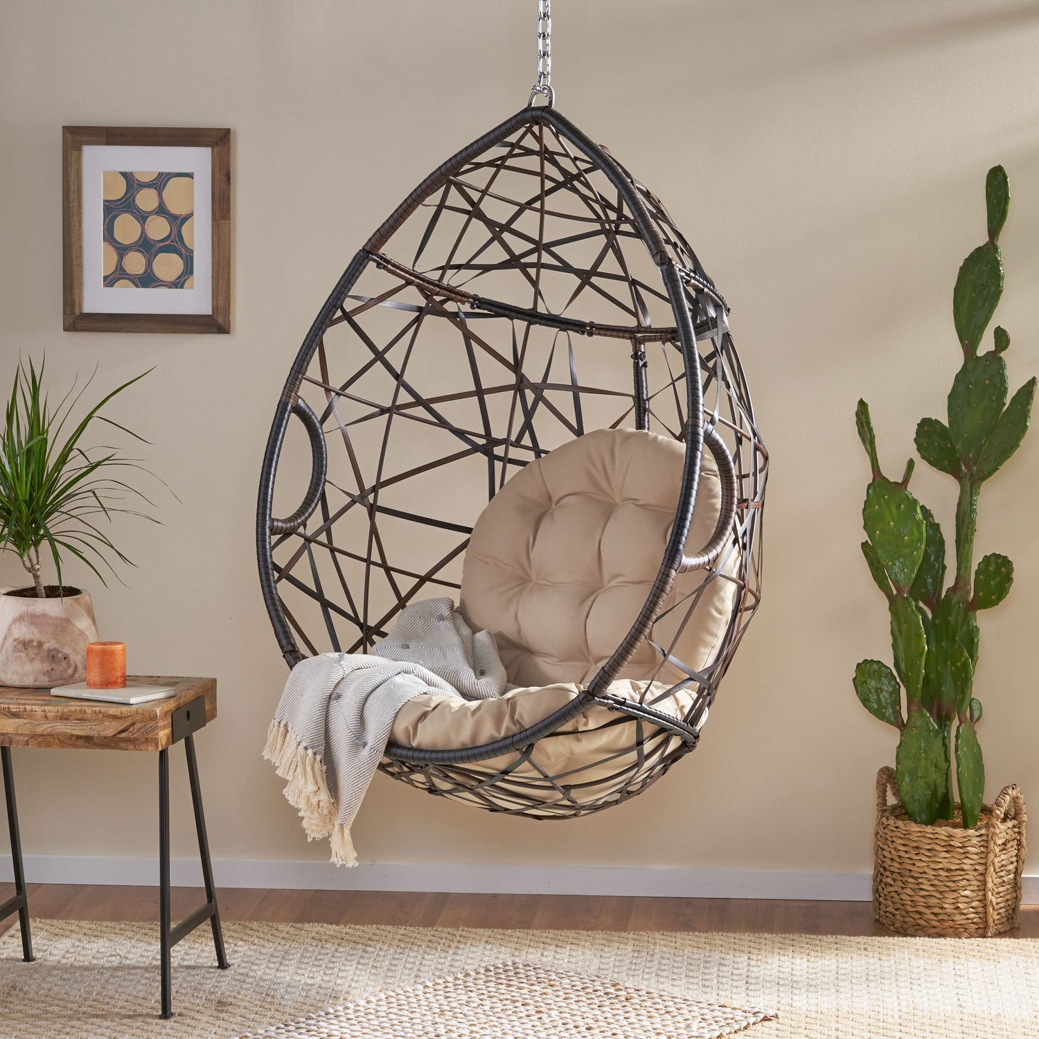 Details: Transform your living space with a delightfully trendy hanging chair of charming style and coziness. Featuring an elegant teardrop shape, this charming accessory not only gives your patio or living room a refreshing transitional look but also offers incredible comfort. This is constructed with beautifully wrapped wicker weave and a sturdy metal frame, allowing you hours of much-needed leisure whenever you need it. Finished with plush water-resistant cushions, this piece can be used both indoor and outdoor, making this a truly extraordinary addition to your lounge space.
