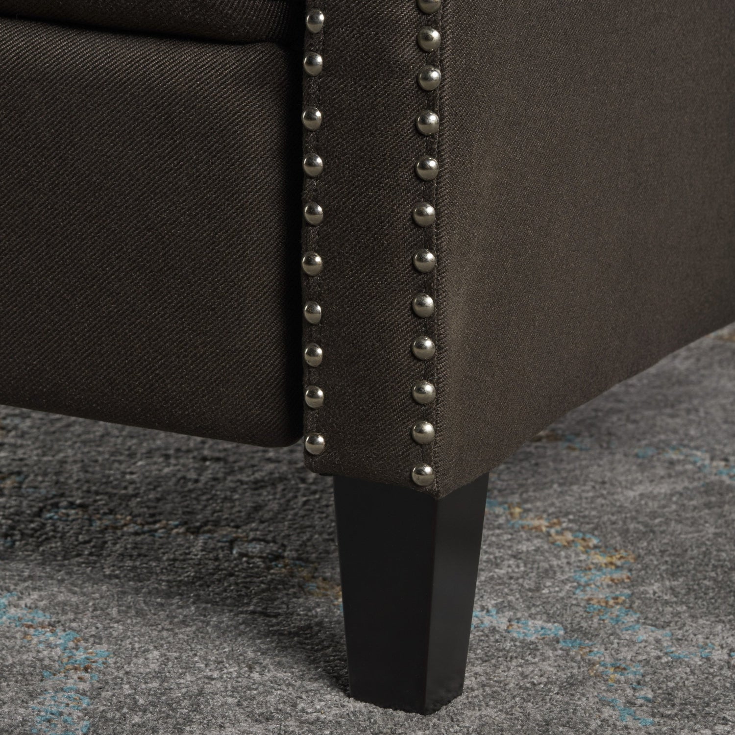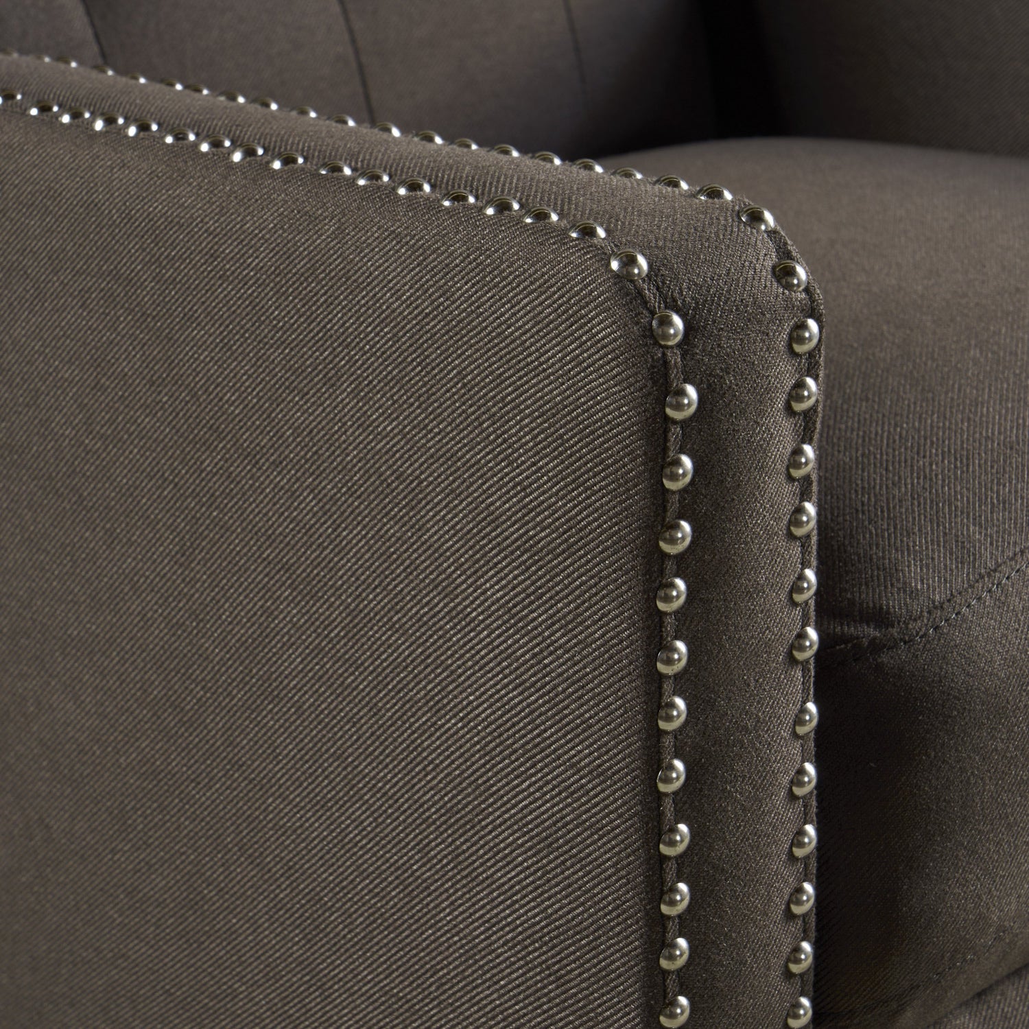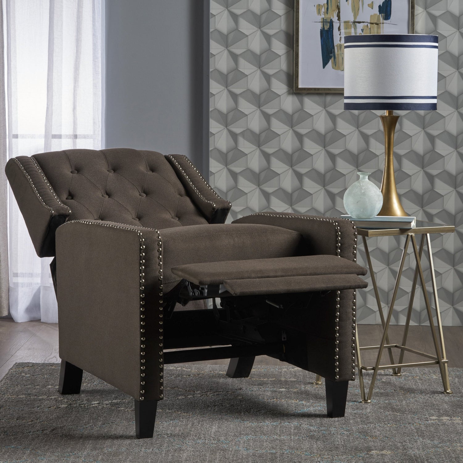 Details: An update on the traditional recliner, this stylish tufted coffee accent chair will add style and function to your living room. With its sleek charcoal fabric and stud accents, this recliner chair will accent your living room décor beautifully. The tufted chair's added reclining function make it the perfect combination of style and comfort.