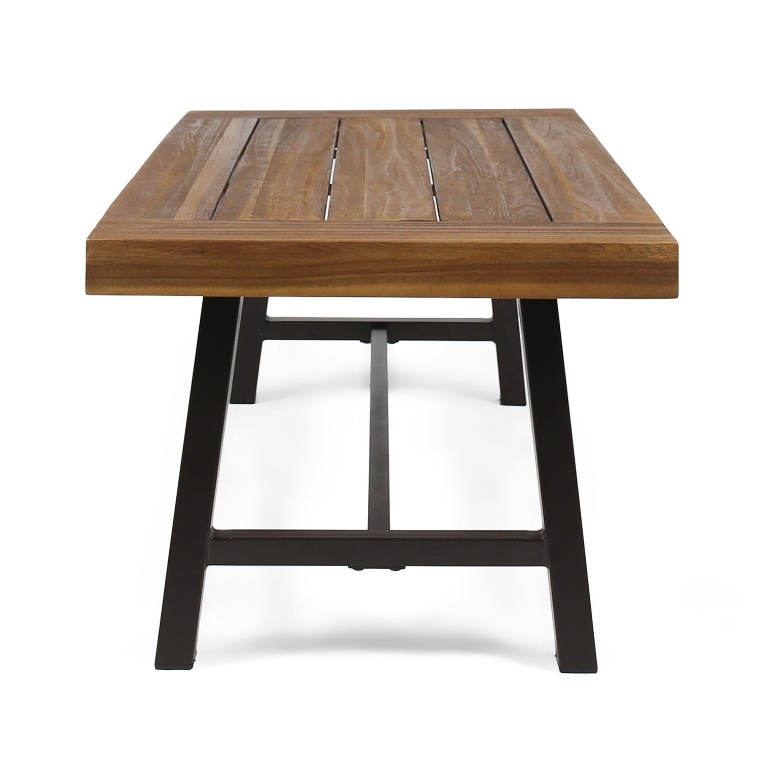 - Add a perfect addition to your outdoor space with this rustic acacia wood coffee table. This table features an iron frame which emphasizes the sandblasted surface to provide a rough yet refined edge to any arrangement.