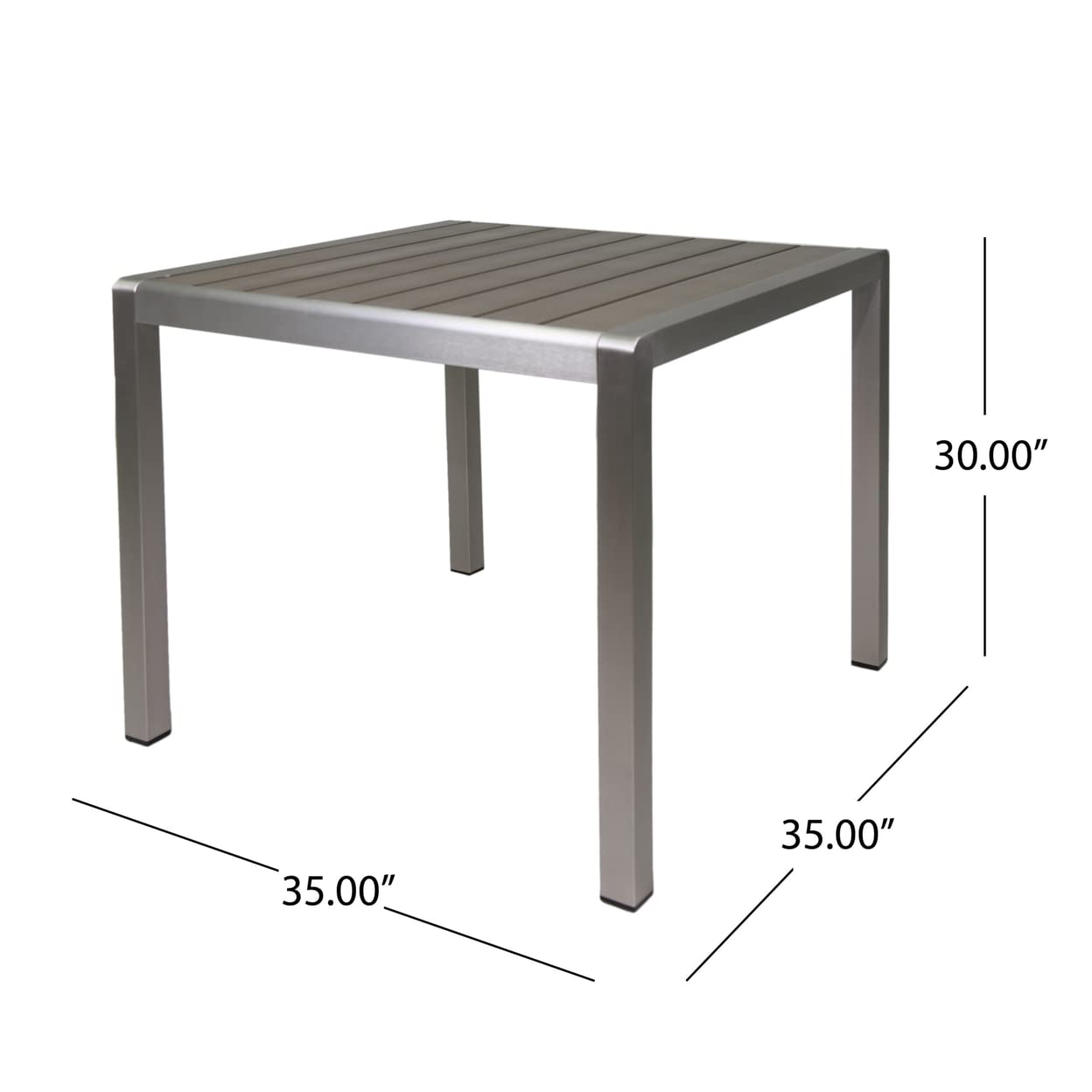 Details: If time and time again you find yourself with a delicious meal and nowhere to set it down upon when dining outdoors, investing in one of our signature square patio dining tables may be just what the doctor ordered. Its stunning aluminum frame offers a stable and durable structure and is reinforced with a chic, slatted faux wood tabletop for bold and contemporary presence that will make a statement on your porch or patio. Includes: One (1) Dining Table Frame Material: Aluminum Multiple Table Top Material Options Frame Finish: Silver Table Top Finish: Gray Some Assembly Required Dimensions: 35.00 inches deep x 35.00 inches wide x 30.00 inches high