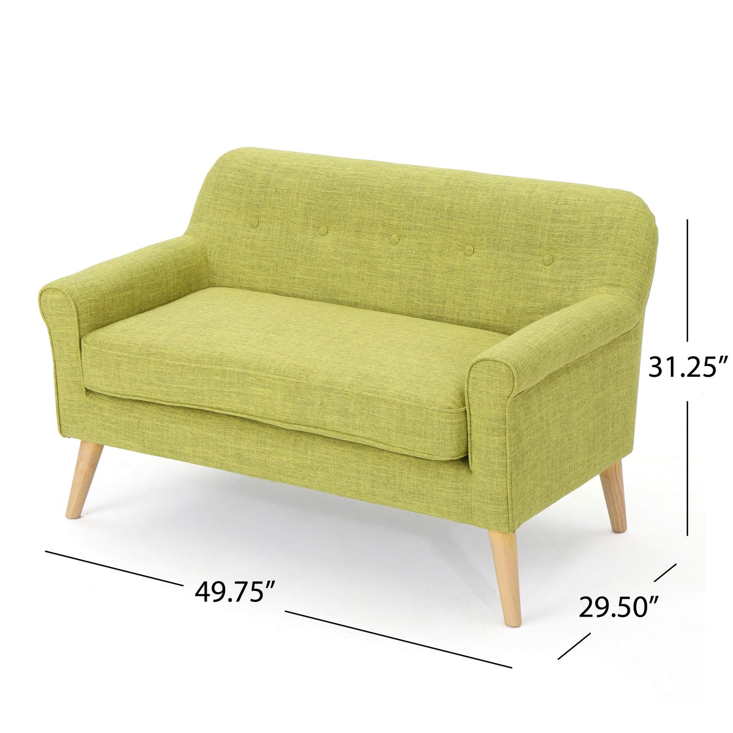 Details: This mid-century styled Loveseat is a wonderful addition to any room in your home. Featuring soft fabric and an extra plush seat cushion, This Loveseat is a comfortable as it is stylish. Prefect for your living room or any other room in your home, You can’t go wrong with this sofa. Product details Includes: one (1) Loveseat material: Fabric, Fabric composition: 100% polyester leg Material: Birch colors available in: muted blue, Muted Green, muted orange, or grey Leg finish: Brown light assembly required Dimensions: 29. 50"D x 49. 75"W x 31. 25"H.