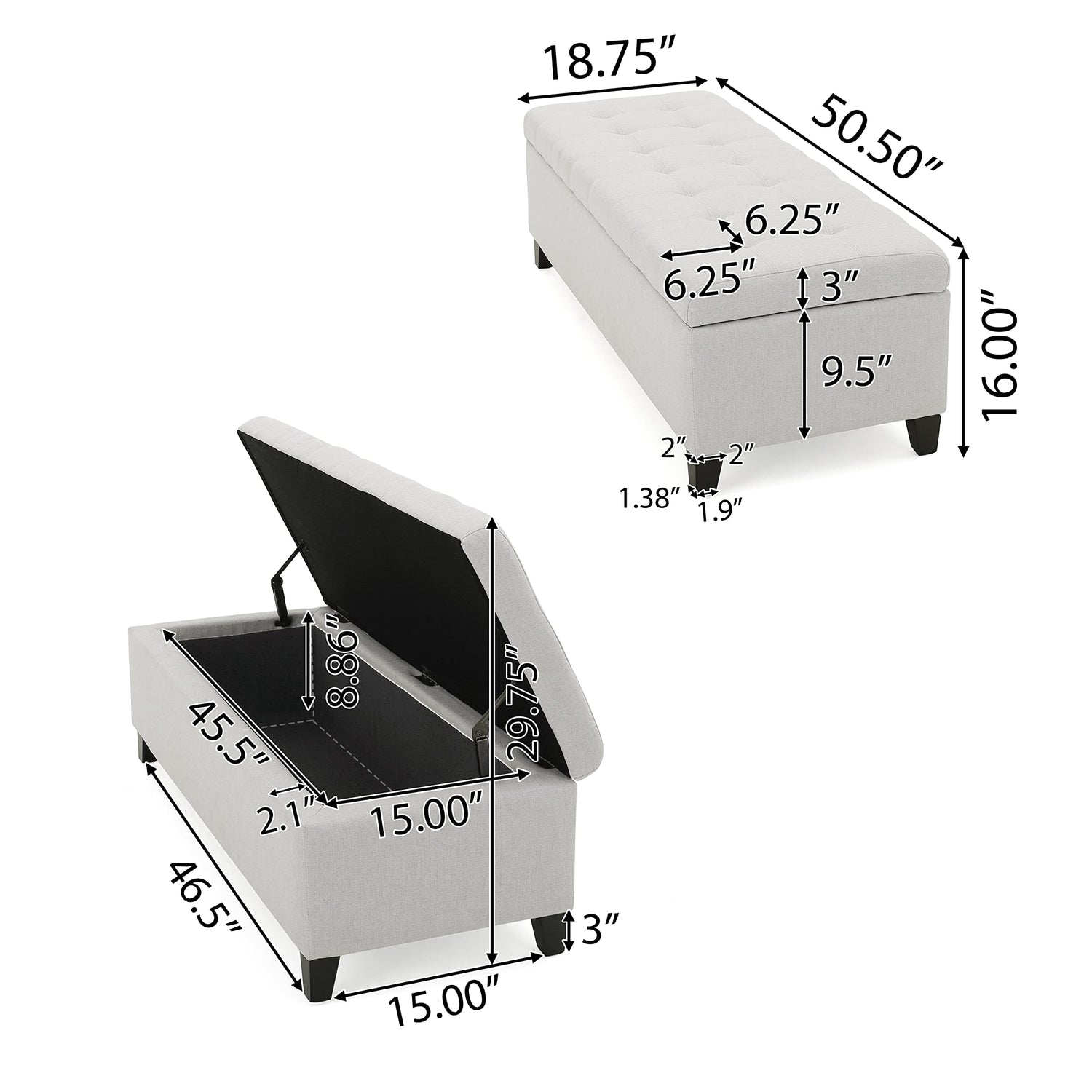 - DIMENSIONS: Choose an accessory that is the perfect size for you and your furniture. This storage ottoman is 50.50" W x 18.75" D x 16.00" H. You will love how much your space can transform with the simple addition of this charming ottoman.