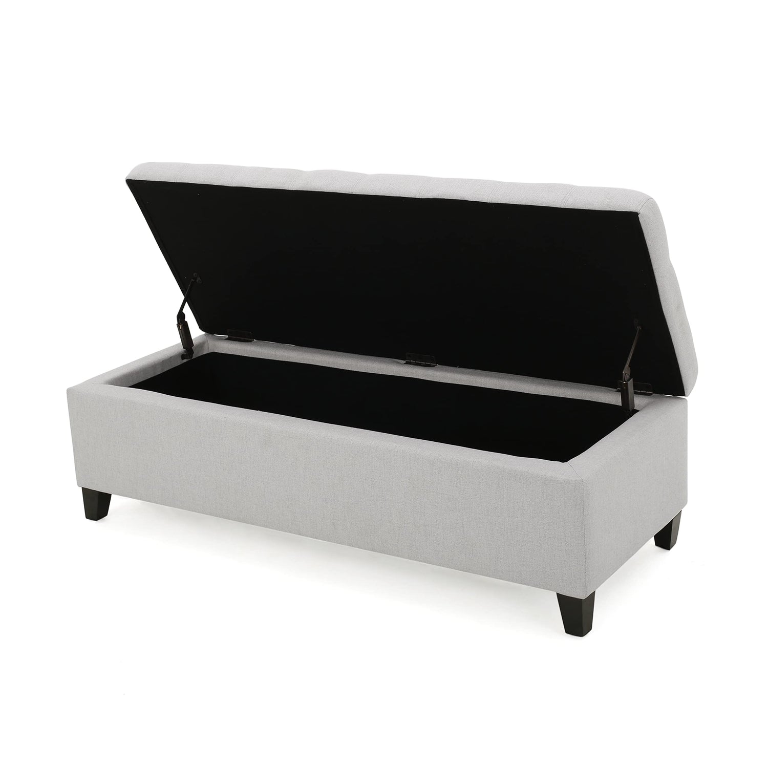 Details: Keep your home stylish and organized with help from this gorgeous storage ottoman. This practical, yet incredibly pretty ottoman features opulent, smooth upholstery with waffle-tufted details for a traditional, sophisticated look. The straightforward silhouette, soft-closing hinges, and abundance of storage space make this ottoman a smart choice for any room. Use it in your living room as a coffee table or additional seating, at the foot of your bed for storage and style, or even in an office for miscellaneous odds and ends. Material: Fabric Leg Material: Birch Wood Multiple Color Options Leg Finish: Dark Brown Assembly Required Dimensions: 18.75 inches deep x 50.50 inches wide x 16.00 inches high Weight Capacity: 250 lbs