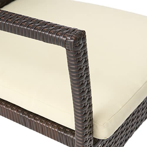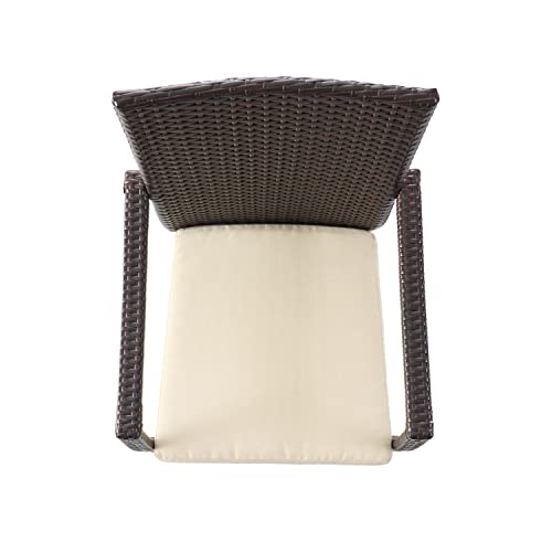 Christopher Knight Home Stamford Outdoor Wicker Dining Set with Acacia Wood Circular Table and Water Resistant Cushions, 5-Pcs Set, Teak Finish / Brown / Crème Cushion