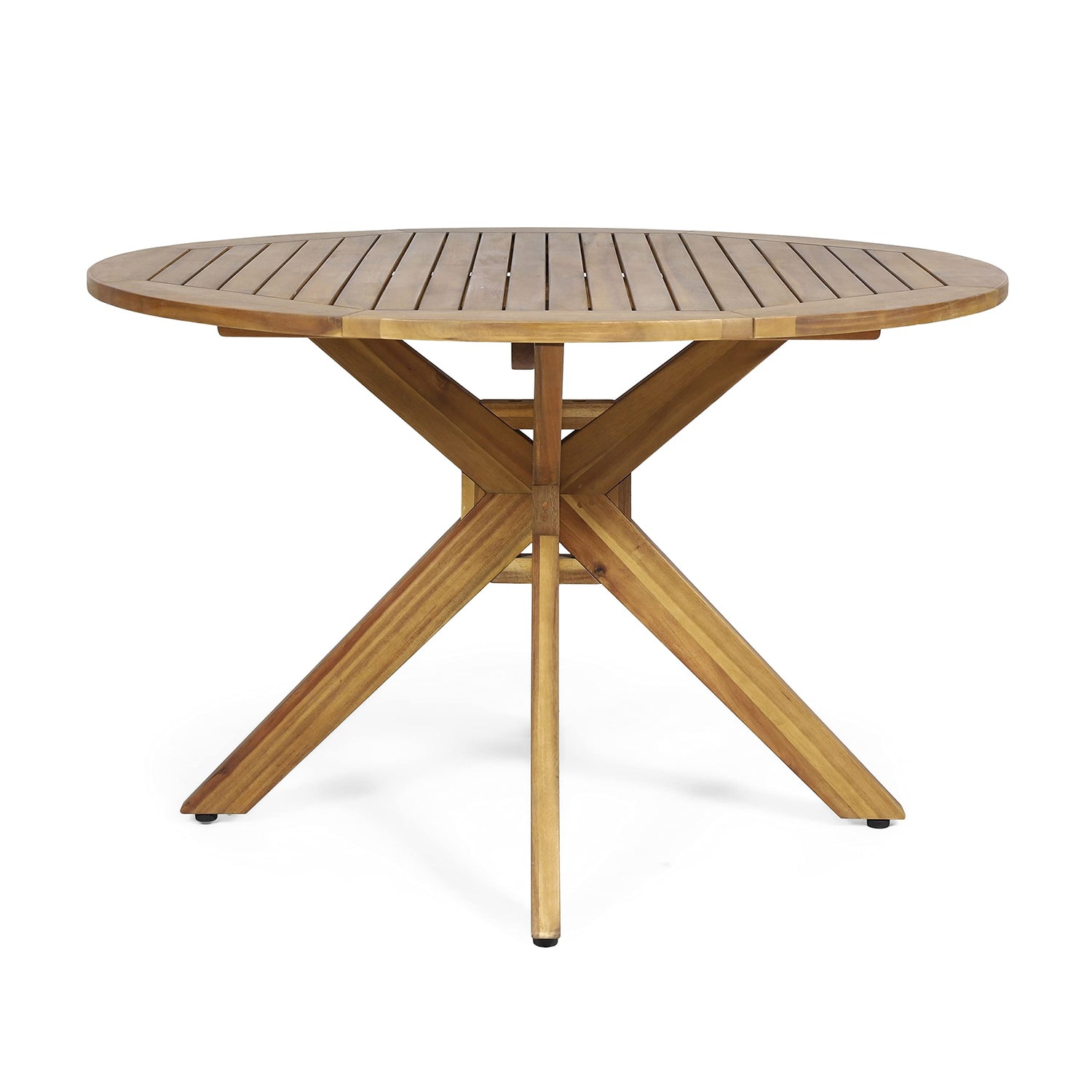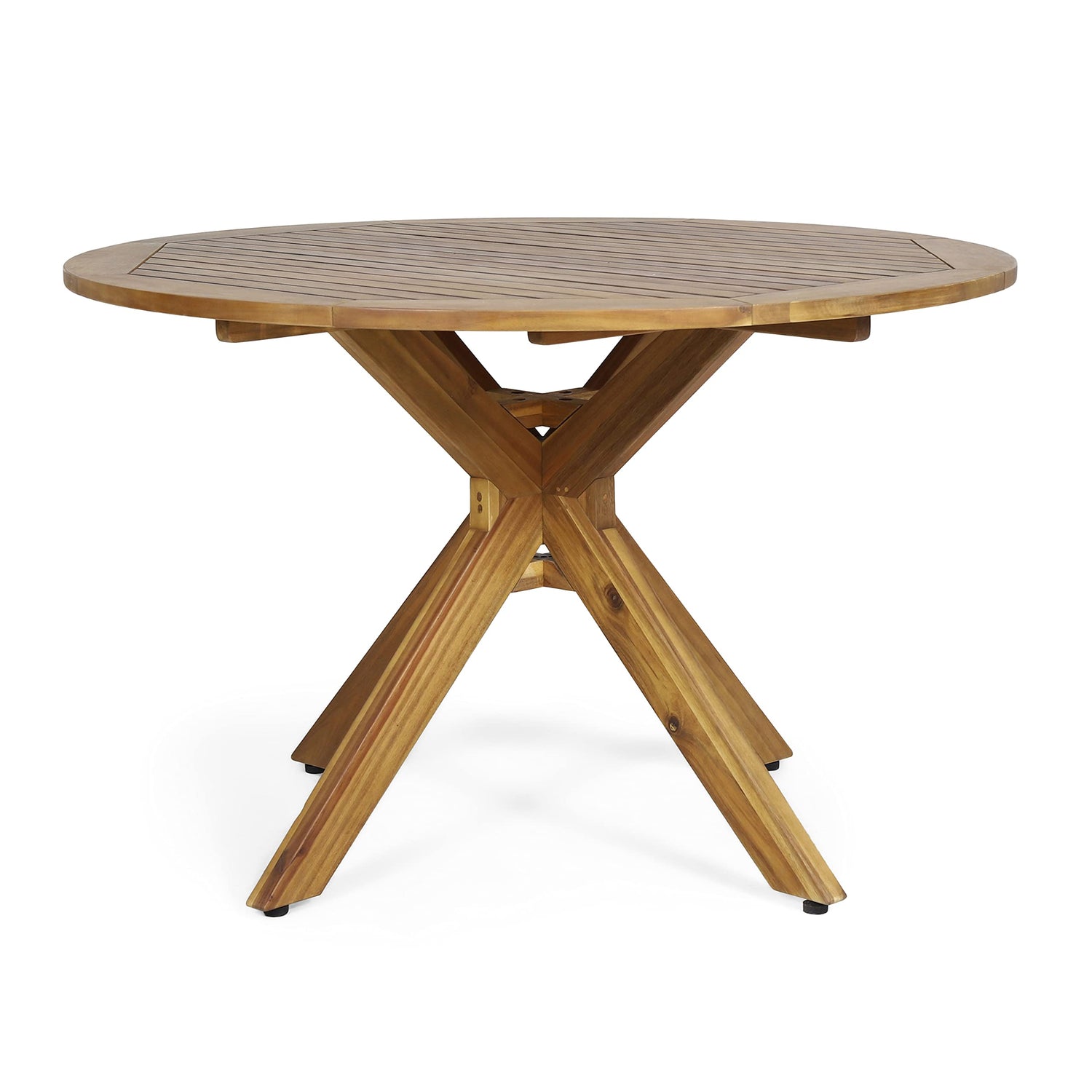Details: Savor every outdoor meal in style and sophistication. Our five-piece set combines function and aesthetics with a charming slat panel tabletop and lovely wicker seating to create the perfect outdoor lounge area. Featuring cozy cushions and a rich round acacia wood table with a cross base, this set is made for impressive luxury and offers enough space for even the most extravagant meal. Table Material: Acacia Wood Chair Material: Faux Rattan Chair Frame Material: Iron Cushion Material: Water Resistant Fabric Multiple Color Options Assembly Required All Dimensions Exclude Cushion Measurements Table Dimensions: 47.25 inches deep x 47.25 inches wide x 29.75 inches high Table Weight Capacity: 300 lbs Chair Dimensions: 25.00 inches deep x 22.25 inches wide x 35.00 inches high Chair Seat Dimensions: 18.00 inches deep x 18.50 inches wide x 16.00 inches high Arm Height: 26.00 inches Seat Cushion Thickness: 2.75 inches Chair Weight Capacity: 400 lbs