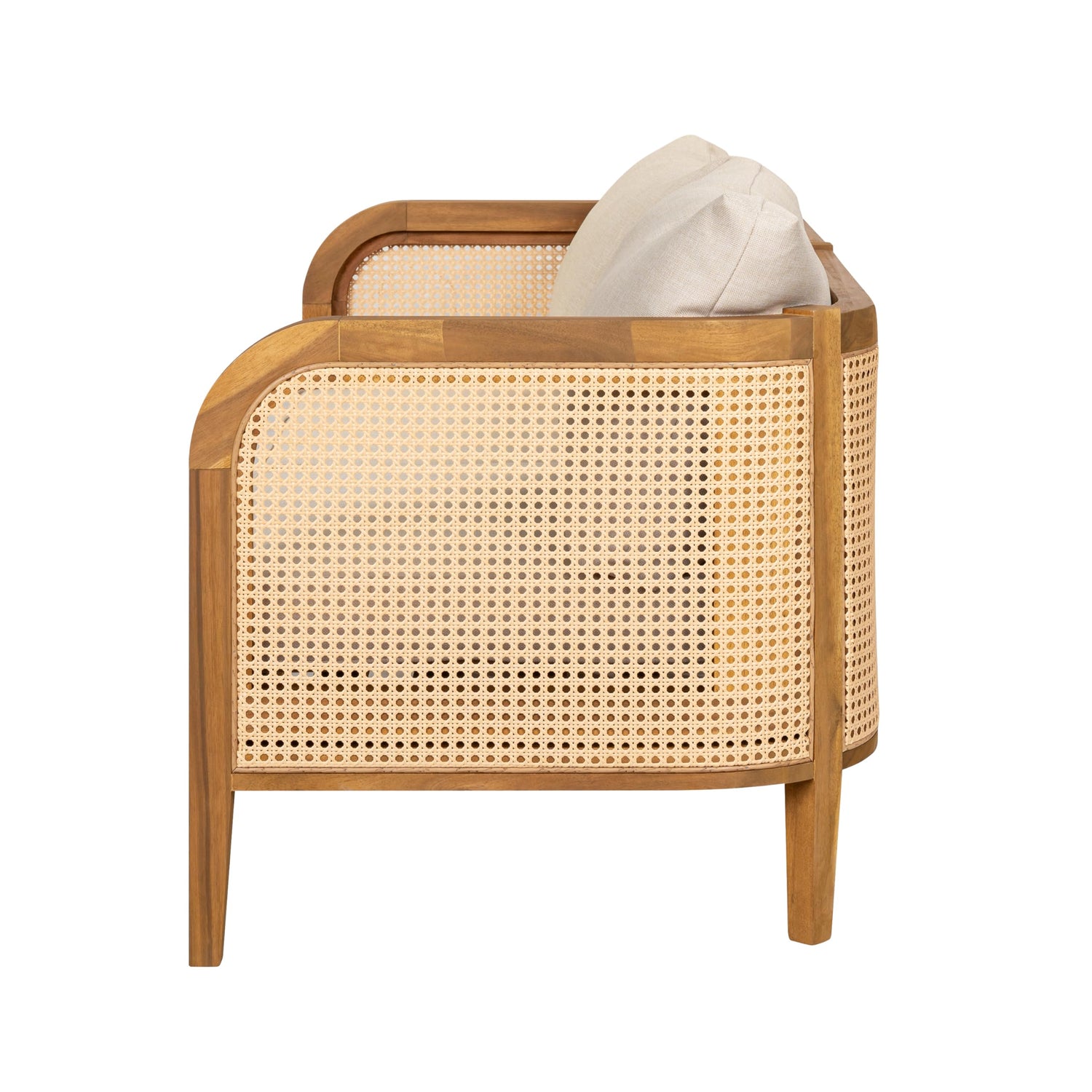 Details: Bring boho charm to your outdoor space with this patio loveseat featuring a slightly curved backrest and natural wood finish. Crafted from durable acacia wood, the frame is accented with hand-wrapped faux rattan detailing on the back and armrests. Designed for comfort and style, it includes plush, removable seat and back cushions. Perfect for patios, porches, or garden seating areas.