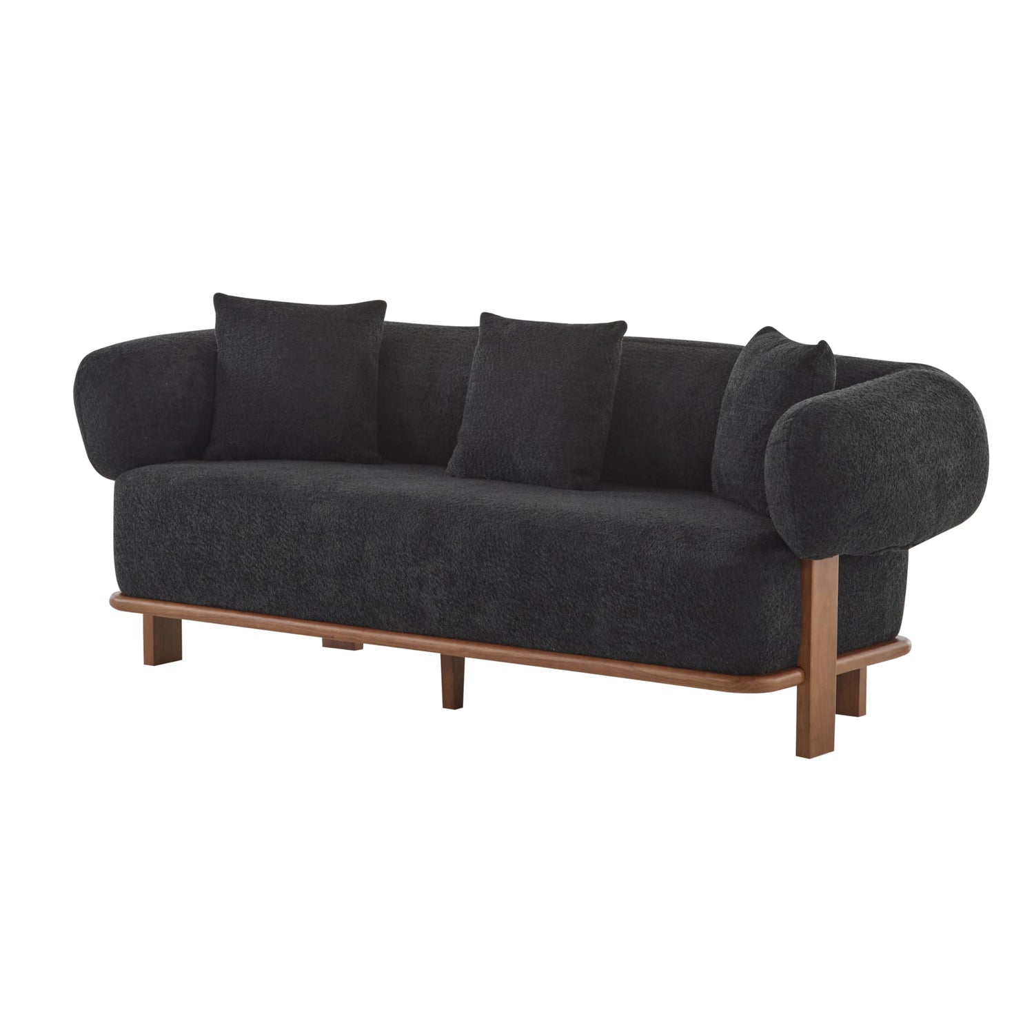 Christopher Knight Home Yule Living Room Wooden 3-Seater Sofa, Boucle Fabric Upholstered Lounge Sofa Couch, Home Office/Bedroom Sofa Chair with Accent Pillow, Comfy Reading Cloud Sofa, Black + Brown
