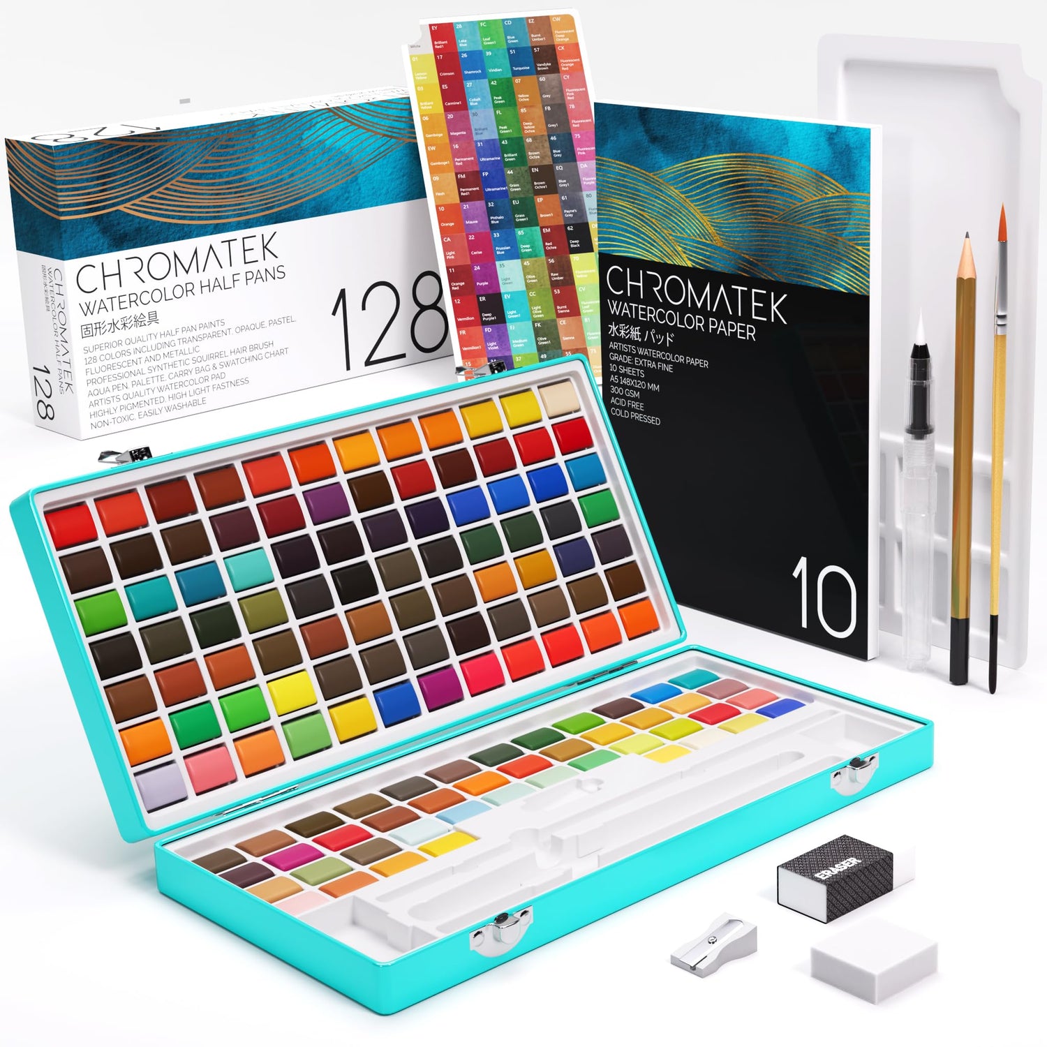CHROMATEK Watercolor Paint Set, 128 Vivid Colors in Portable Box, With Pad, Brushes and Everything Else you Need to Start Painting, Travel Kit