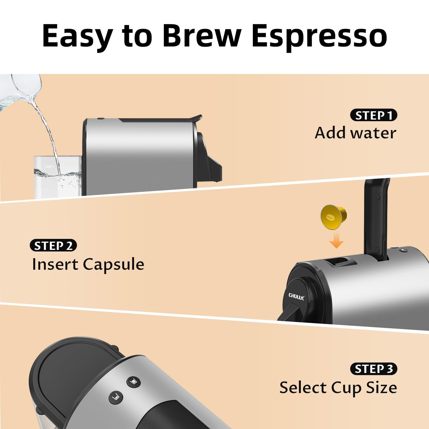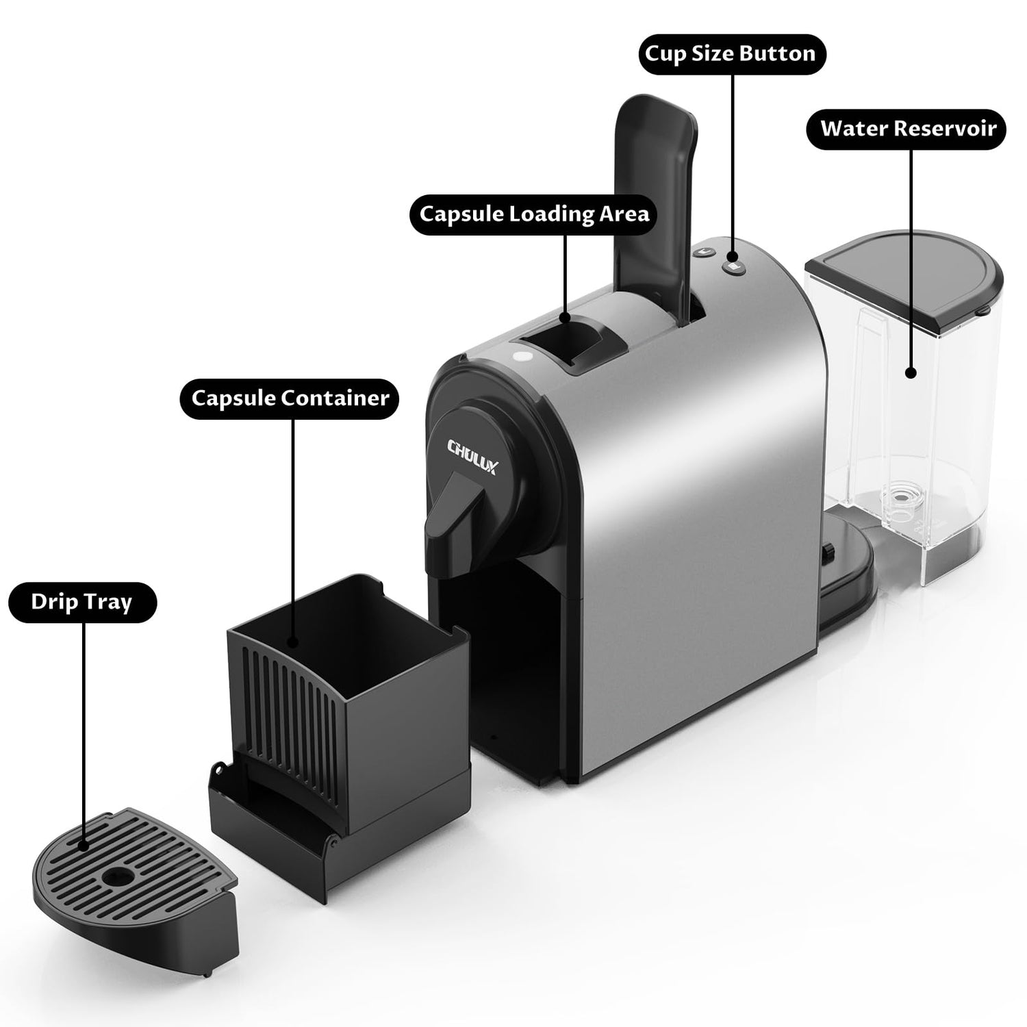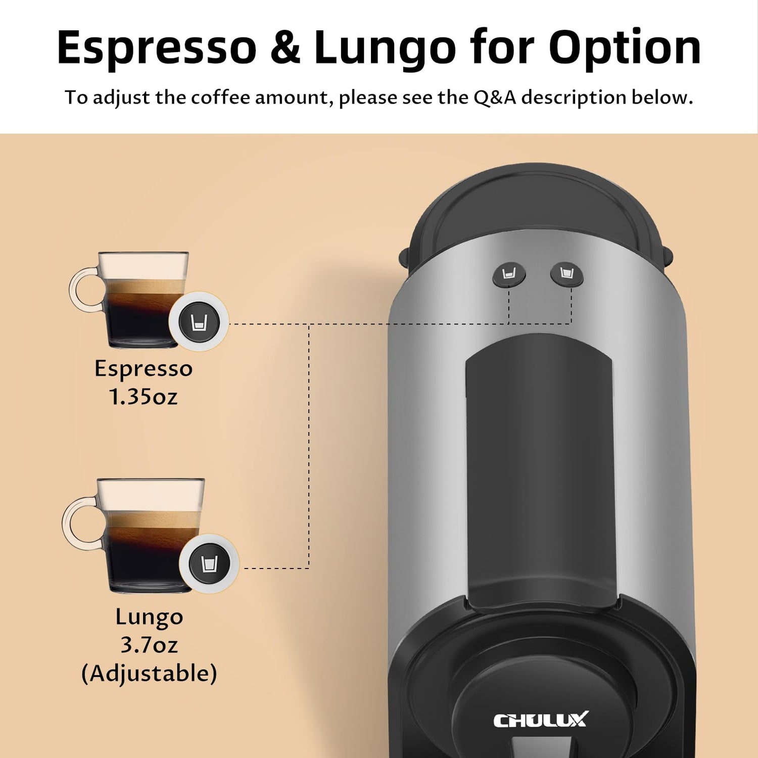 - 【2 Cup Size for Option】The CHULUX espresso pod machine is compatible with Nespresso capsules and other brands capsule for home made coffee. Then choose the Espresso or Lungo button for better taste depending on different capsules and personal preference.