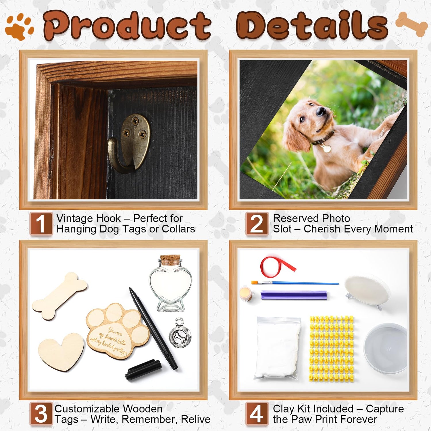 - Complete Dog PET Memorial Kit for Lasting Memories: this pet memorial gift set includes: 1 dog shadow box photo frame, 1 glass bottle, 1 clay dog paw set, 2 decorative hooks, an oil-based marker, and dog bone, heart, paw shaped wood pieces; Everything you need to create a touching memorial is included in one dog memorial kit